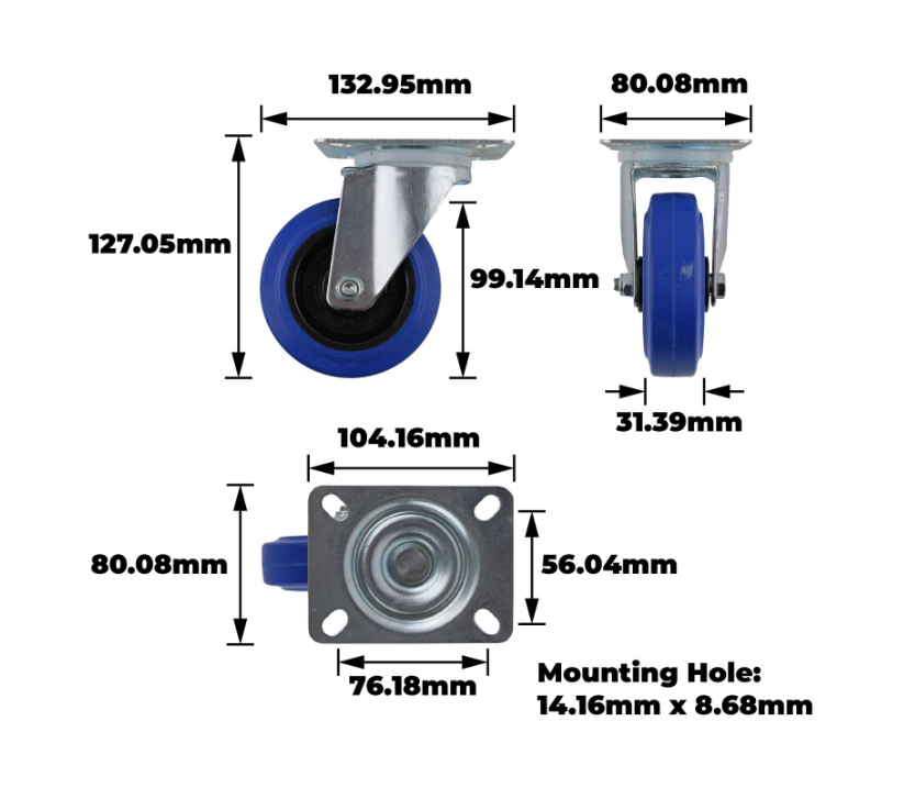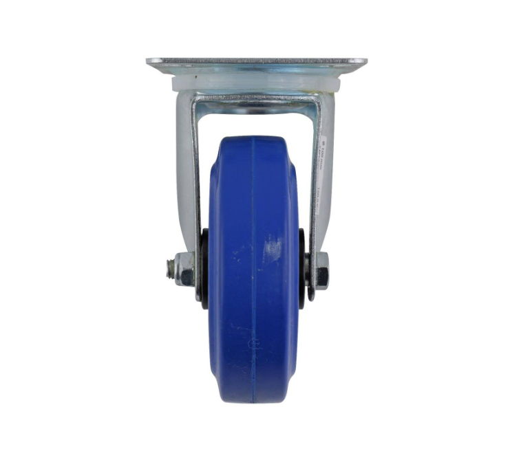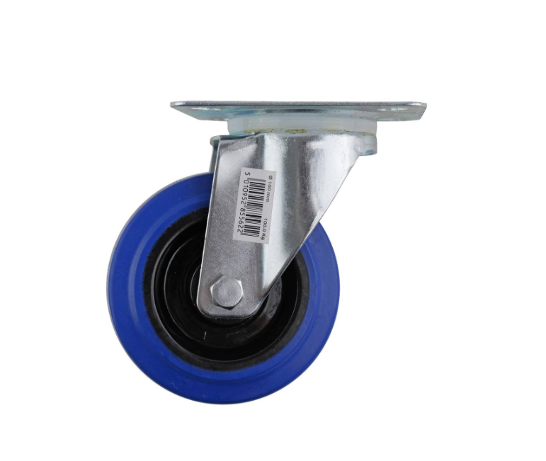 Blue elastic rubber swivel wheel 100mm designed for robust DIY applications. Featuring a roller bearing and a zinc plated top measuring 105x85mm, this caster is engineered for precise manoeuvrability and dependable performance. Its double ball raceway and plain bearing system work together to support a 100kg load. Ideal for customised mobile solutions and heavy-duty projects, this caster offers technical advantages and durability for the discerning DIY enthusiast.Detailed