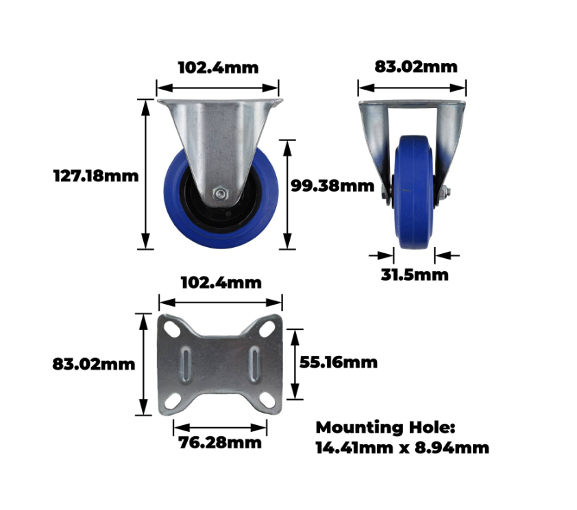 Blue elastic rubber fixed wheel 100mm, zinc plated top 103X85mm, 160kg
