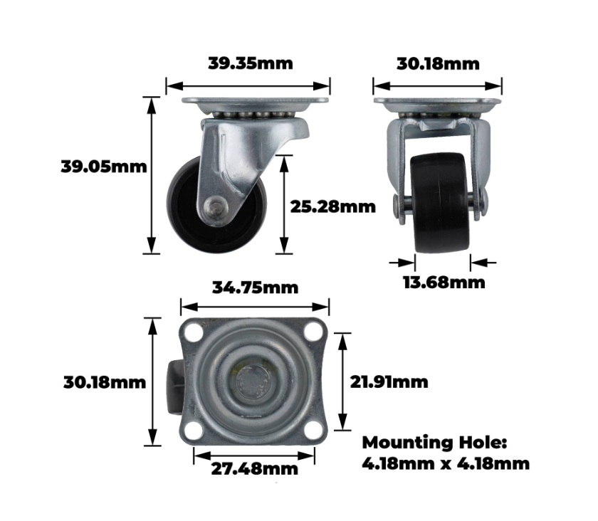 Black Polypropylene Swivel Castor – This black polypropylene swivel castor features a 25mm wheel and a 35x30mm top plate, offering excellent manoeuvrability and secure mounting for various DIY applications. The zinc plated steel housing and plain bearings ensure durability and consistent operation under loads up to 10kg. Its compact design and robust construction make it a practical choice for both domestic and industrial projects, providing reliable performance for the discerning DIY enthusiast.Detailed