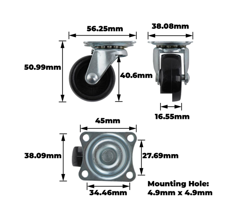Black Polypropylene swivel wheel is engineered for precision and practicality in diverse DIY applications. The robust design features a 38mm wheel paired with a 46X38mm top plate for enhanced stability and a single raceway for smooth movement. Zinc-plated steel housing and high-quality polypropylene ensure durability, making it ideal for projects that demand reliable performance. Weighing just under 70 grams, this component comfortably meets tasks involving heavy loads up to 25kg.Detailed
