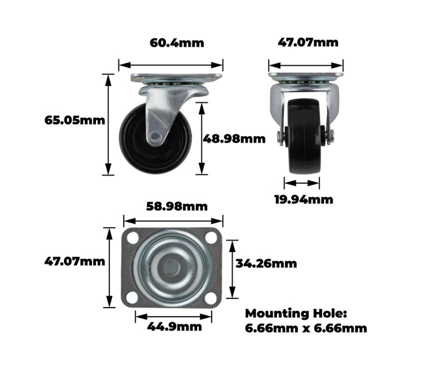 Black Polypropylene Swivel Wheel – This robust swivel wheel is engineered for precision and durability in a range of DIY and light industrial applications. The 50mm wheel features a double ball raceway and is supported by a steel housing with plain steel bearings. With a top plate measuring 59x47mm, it offers a secure installation while reliably carrying loads up to 30kg. Its polypropylene construction ensures resistance against wear and effective performance under demanding conditions.Detailed