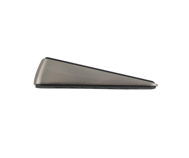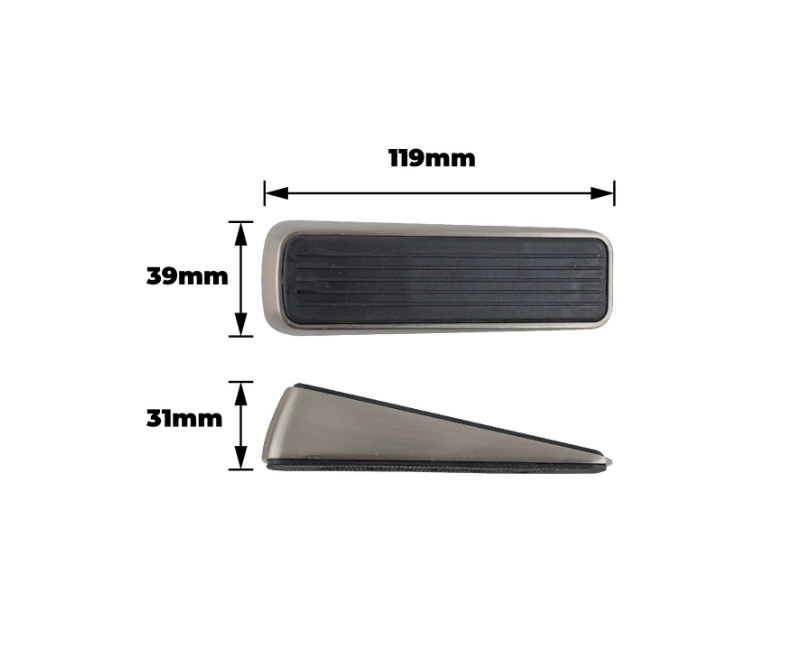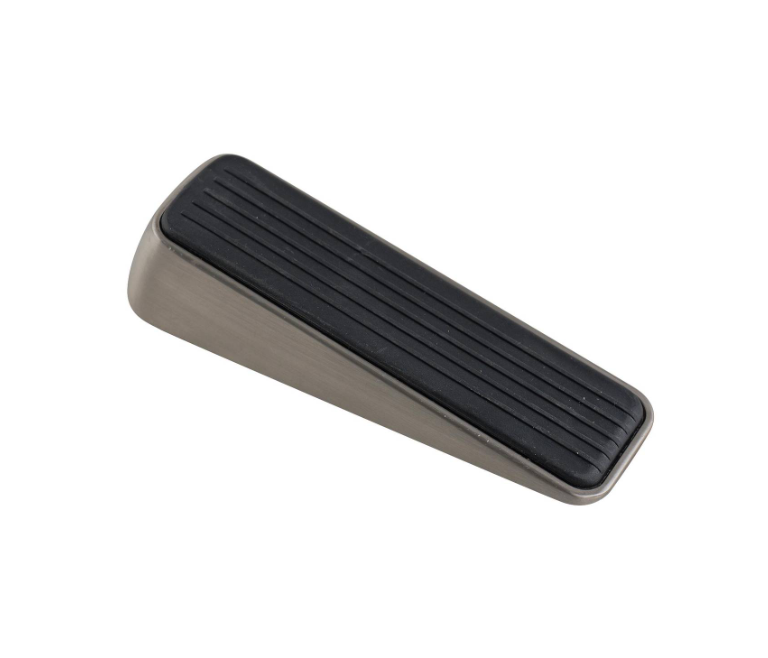 Designer Door Wedge SN is a floor mounted door stop designed for practical door management in busy household environments. Crafted from durable zinc alloy and rubber, it provides reliable door hold and reduces unwanted movement. The satin nickel and black finish enhances its modern appeal while offering long-lasting performance. Ideal for DIY-savvy enthusiasts, its clamshell design ensures secure packaging and straightforward installation.Detailed