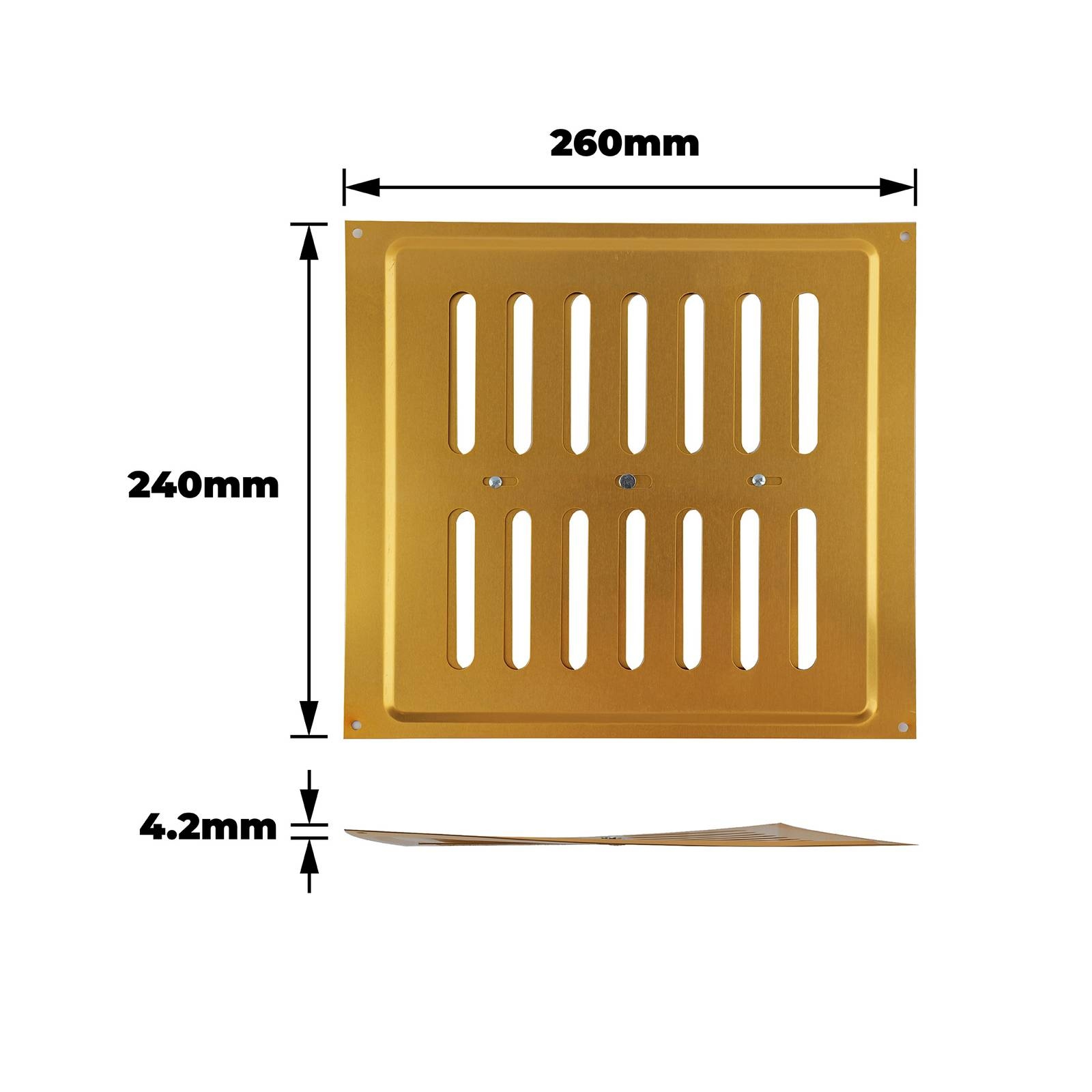 SELECT HARDWARE Vent Adjustable Aluminium 9x9" Gold is an adjustable vent designed for DIY enthusiasts building or renovating ventilation systems. The refined anthracite finish and precise rectangular design ensure optimal air flow and temperature control in residential or workshop settings. Made from durable aluminium, this vent offers long-lasting performance, easy installation and maintenance while allowing adjustable control to suit specific airflow requirements effectively.Detailed