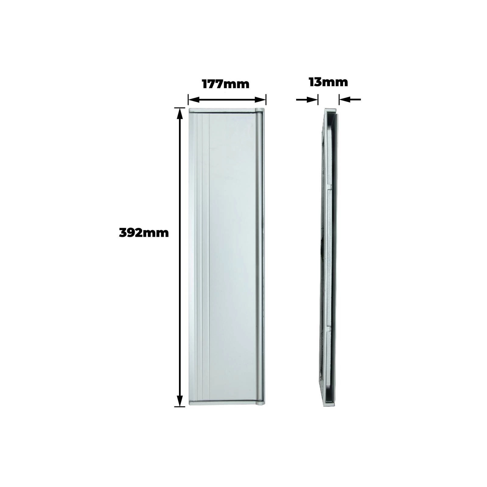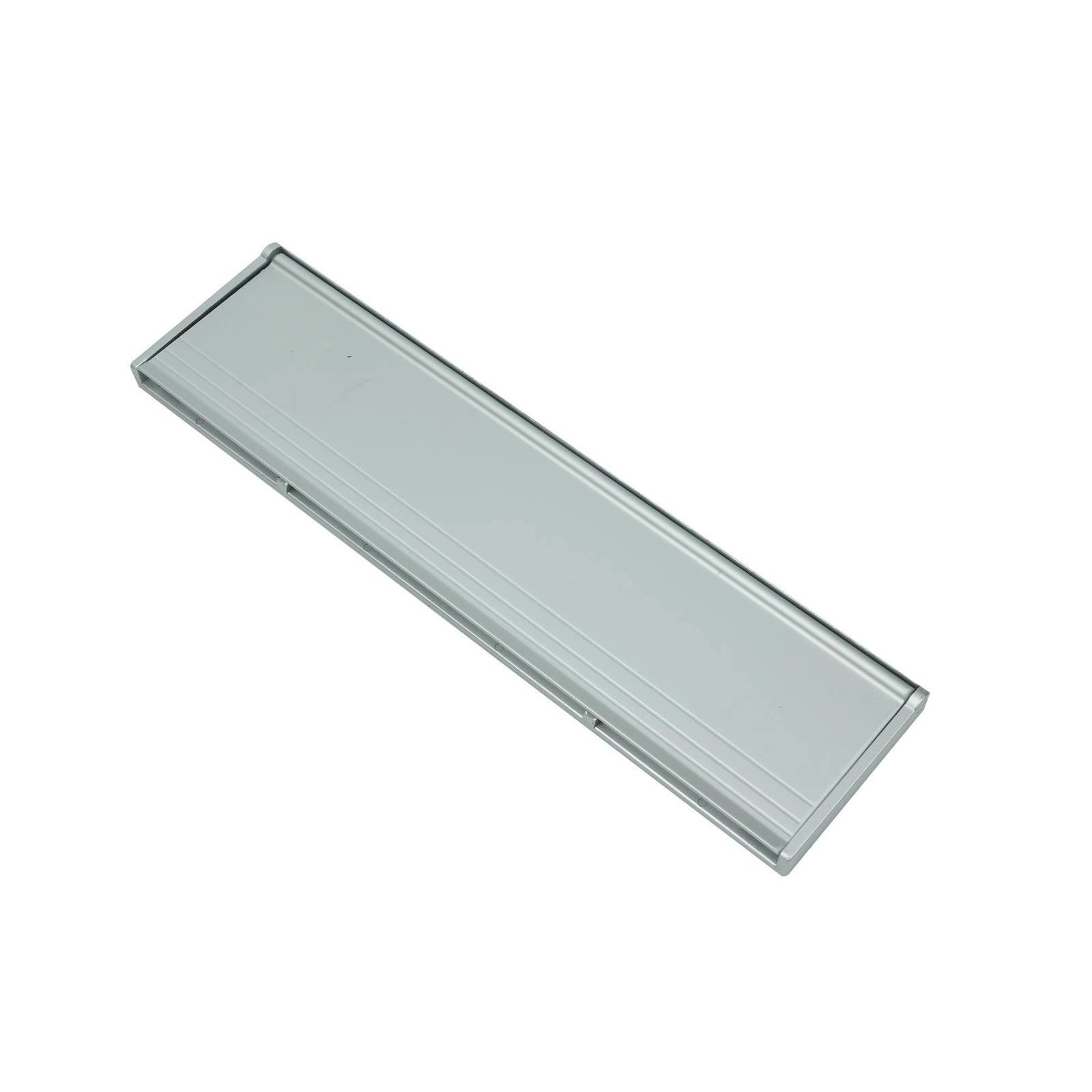 FLUSHBACK 12" L/P BULK is a practical mail slot designed for secure and efficient mail delivery. Crafted with a precise rectangular shape and a distinctive black and silvery finish, this item is ideal for DIY enthusiasts seeking a reliable installation solution. Its lightweight design at 198 grams ensures ease of mounting and handling, while the bulk packaging in a polybag simplifies storage and shipping. Suitable for both residential and commercial applications, it offers a technical balance of form and function.Detailed