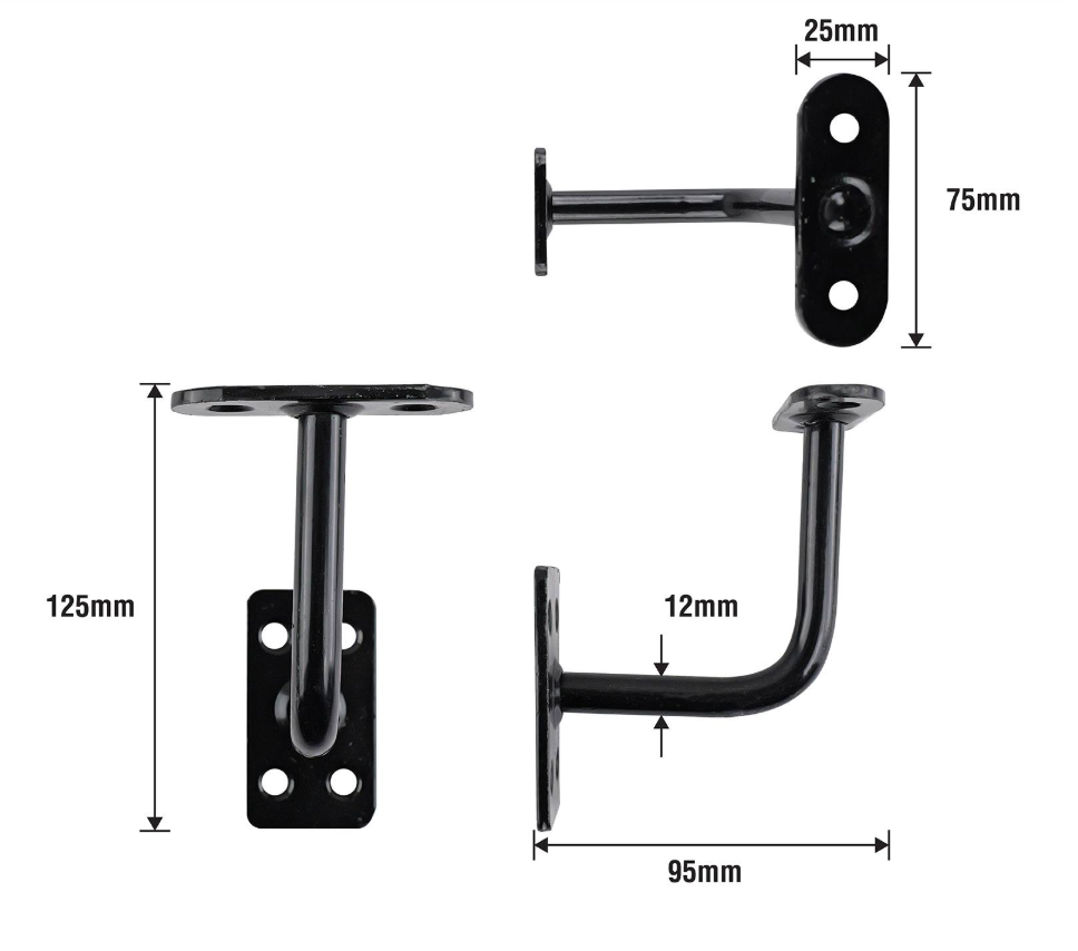 The Carinya handrail bracket is a durable black fitting designed to provide robust support for handrails in staircases and walkways. Crafted for easy installation, this product is essential for both safety and aesthetics in any DIY project. Its sturdy construction ensures reliability, making it ideal for residential or commercial applications where strength and style are required.Detailed