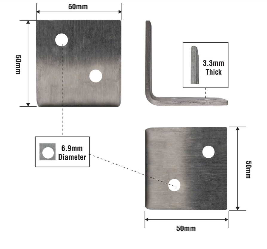 - Compact 50x50x50mm bracket with 3.5mm thickness