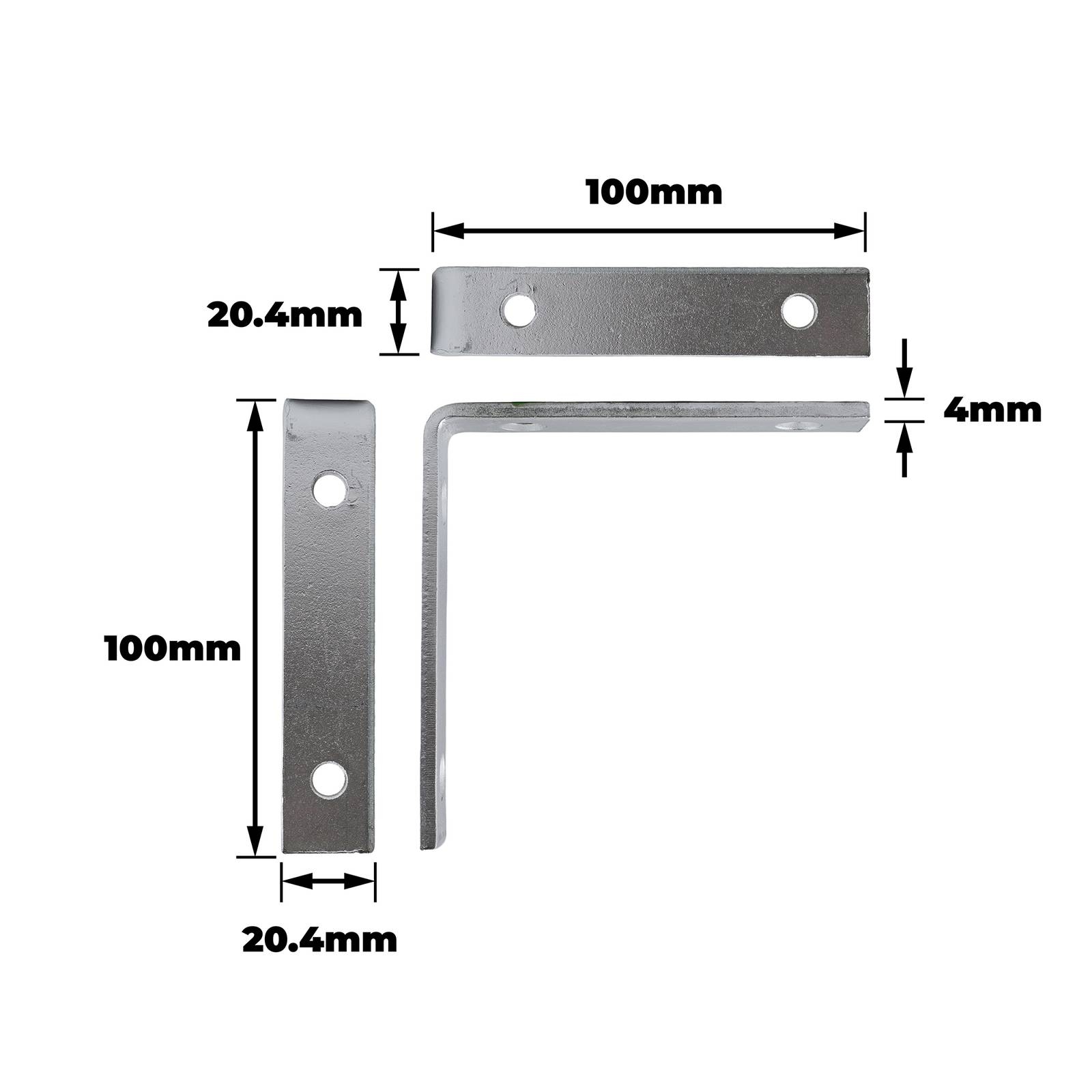 ANGLE BRACKET - ZINC PLATED 100x100x20x4mm is a robust steel component designed to provide structural reinforcement in a variety of DIY projects. The zinc plating enhances durability while resisting corrosion, making it a practical choice for home improvement and building repairs. With a load capacity of 75 kgs, this bracket delivers reliable strength and stability, ensuring secure mounting and improved project longevity for DIY-savvy users.Detailed