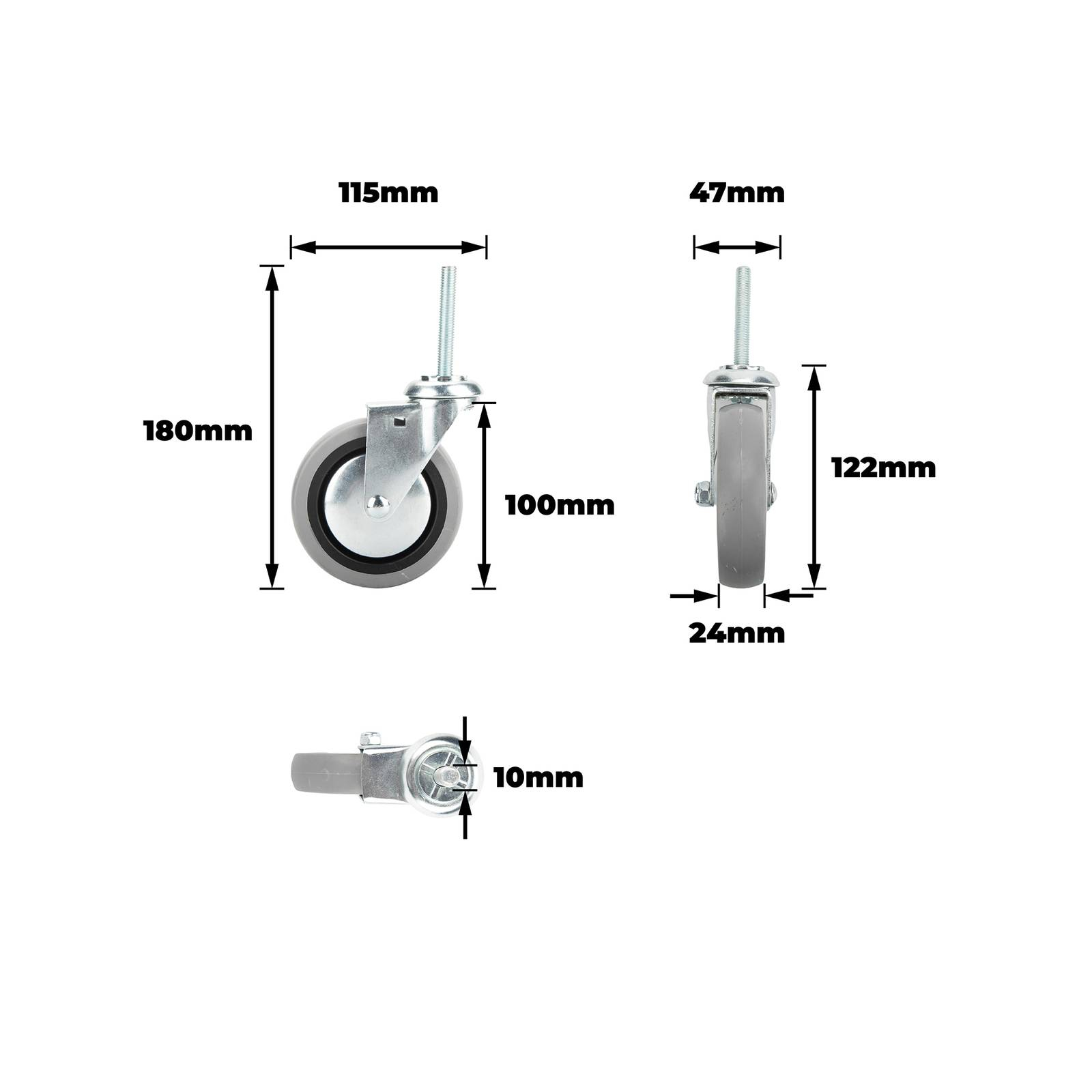 easyroll: 100MM GREY RUBBER SWIVEL EXPBOLT FITTEDThis swivel is engineered for precision and reliability in DIY projects and industrial applications. Designed with a double raceway and plain bearing system, it delivers consistent, smooth rotation under loads up to 55 kgs. The robust steel housing, nylon wheel core and soft grey rubber tyre work together to offer durability, quiet operation and surface protection, making it a practical solution for technical, detail-oriented enthusiasts.