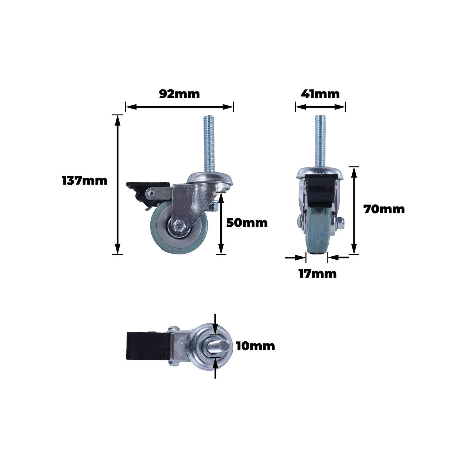 - Soft grey rubber tyre delivers non-marking, quiet operation under load.