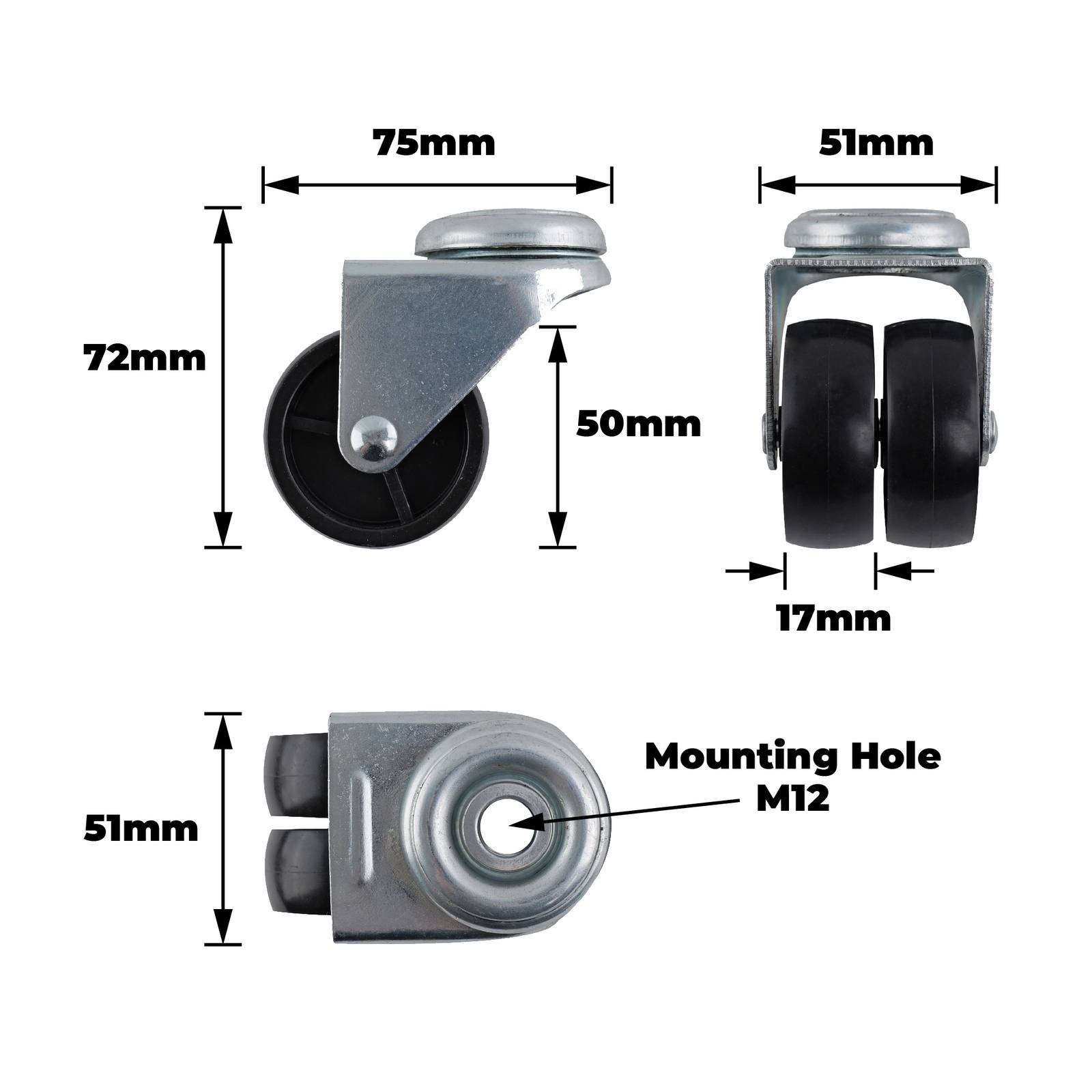 50MM BLACK NYLON TWIN WHEEL BOLT HOLE CASTOR