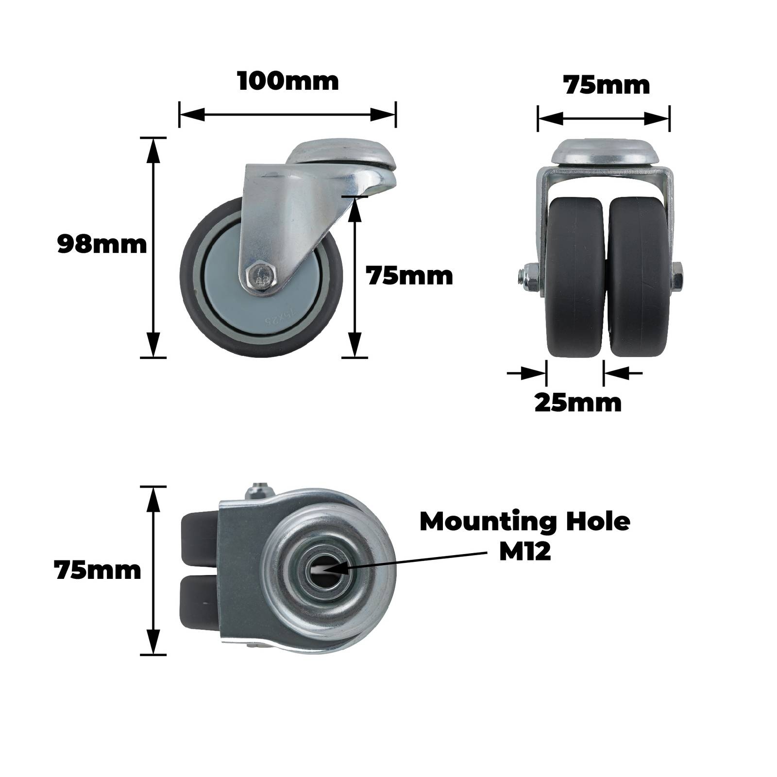 easyroll 75MM GREY RUBBER TWIN WHEEL BOLT HOLE CASTORThis castor is engineered for dependable performance in DIY projects and industrial applications. Designed with plain bearings and a dual raceway system, it supports loads up to 70 kg while ensuring smooth manoeuvring. The stainless steel housing contributes to long-lasting durability, and the M12 mounting size facilitates straightforward installation. Ideal for users requiring precise technical specifications and practical reliability in equipment mobility.