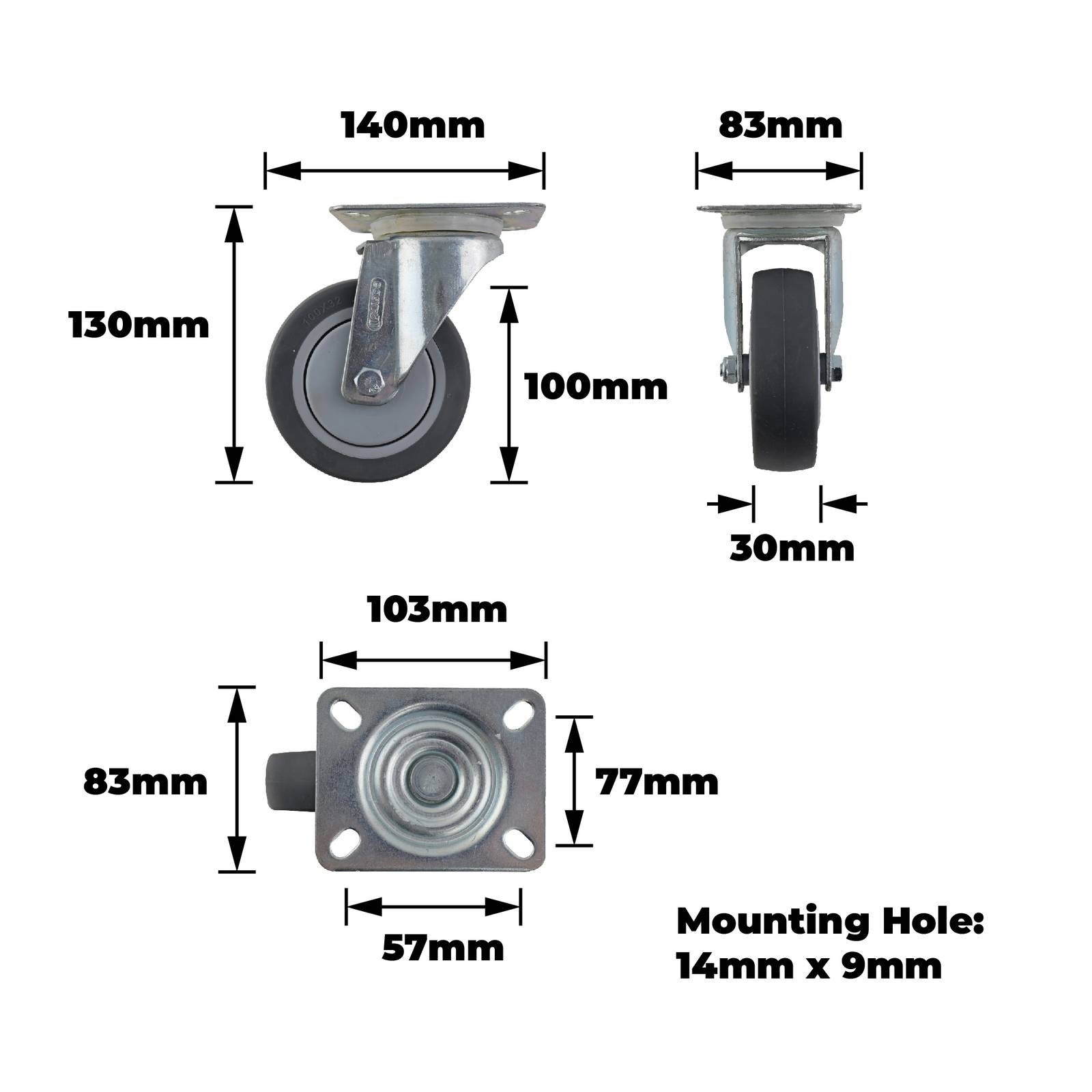 100MM GREY RUBBER SWIVEL PLATE 100KG 15800