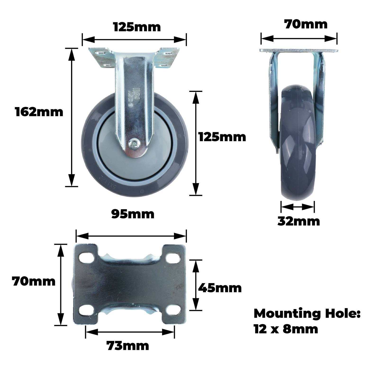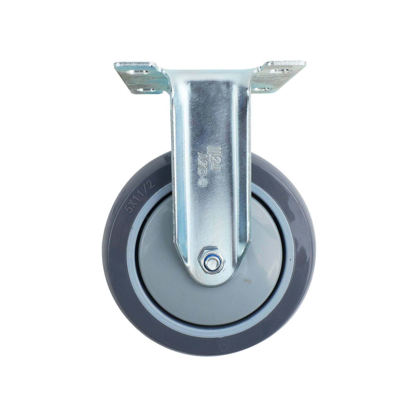 125MM GREY URETHANE FIXED PLAT is a fixed castor designed for precision and durability. Ideal for DIY projects and professional institutional settings, it features a robust zinc plated steel housing, a NYLON wheel core, and precision bearings that reduce rolling resistance. The fixed plate supports straight tracking during movement, while the soft grey urethane ensures non-marking performance and longevity under loads up to 130 kgs.Detailed