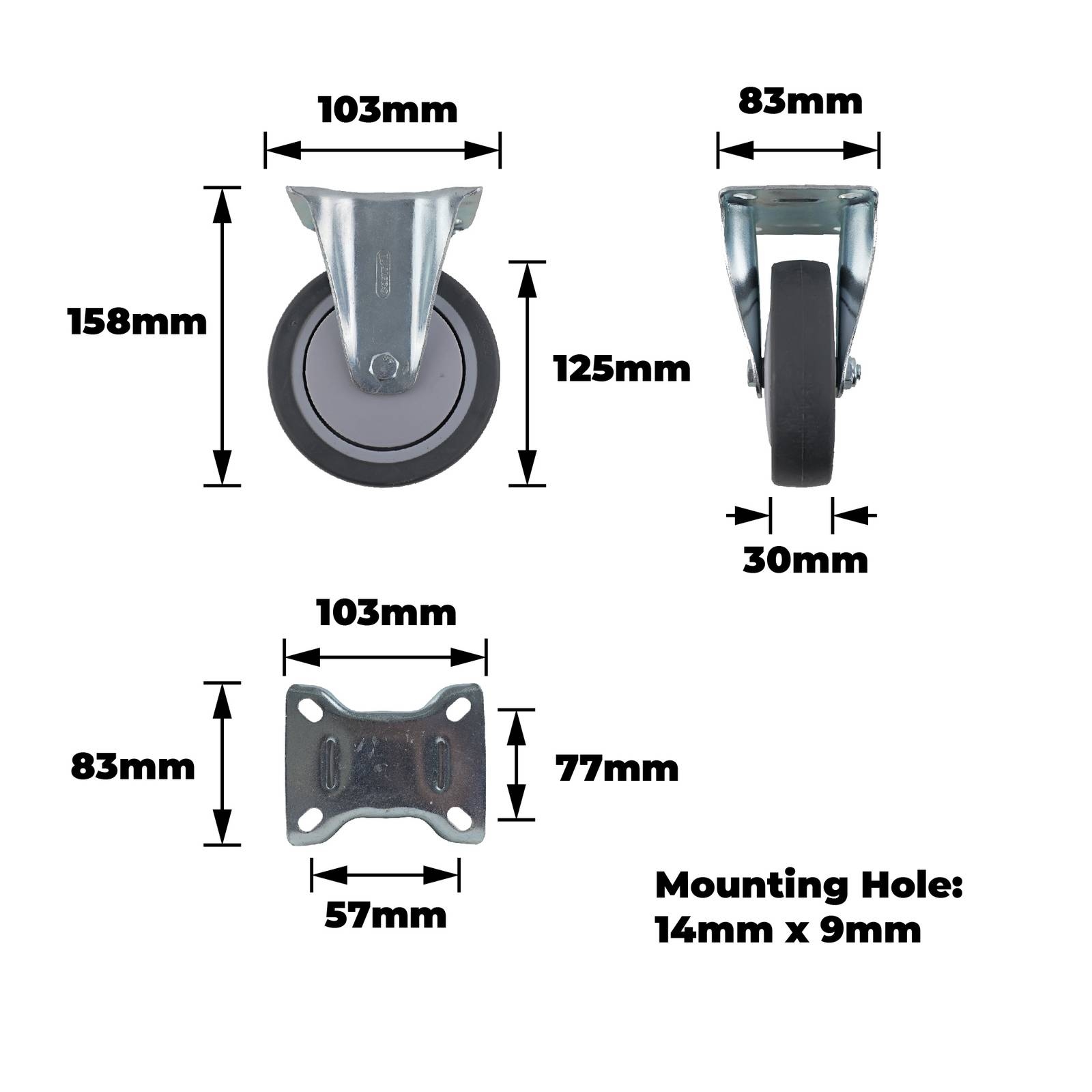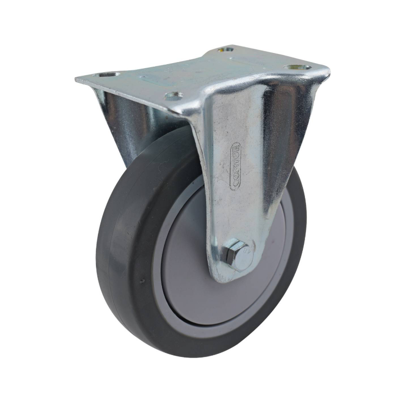 125MM GREY RUBBER PLATE FIXED 100KG 15805 is a fixed castor engineered for demanding DIY projects that require precise load-handling and reliable movement. It features precision bearings and a single raceway design that facilitate smooth manoeuvring under heavy loads. Constructed with robust steel housing, a polypropylene wheel core and a TPR wheel, this castor is built to endure rigorous use. It is ideal for DIY enthusiasts seeking technical reliability and long-lasting performance.Detailed
