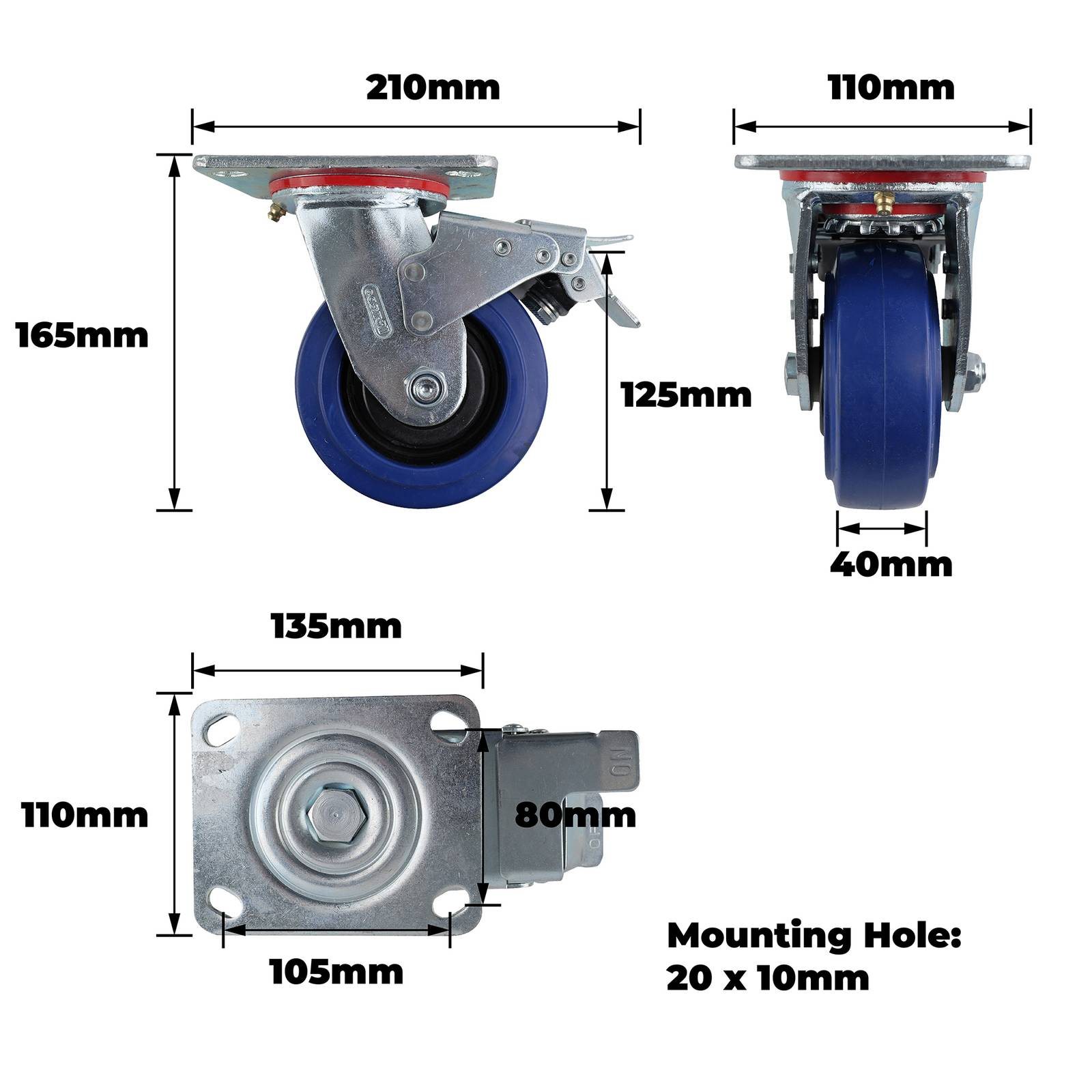 This precision-engineered swivel brake castor is designed for DIY applications that require dependable movement and braking. It features a 125mm wheel with a blue rubber finish, a robust polypropylene core, and a steel housing for durability. With precision bearings and a load capacity of 240 kgs, it ensures smooth rotation and effective braking. Ideal for both commercial and domestic projects, this castor delivers practical, high-performance mobility solutions.Detailed