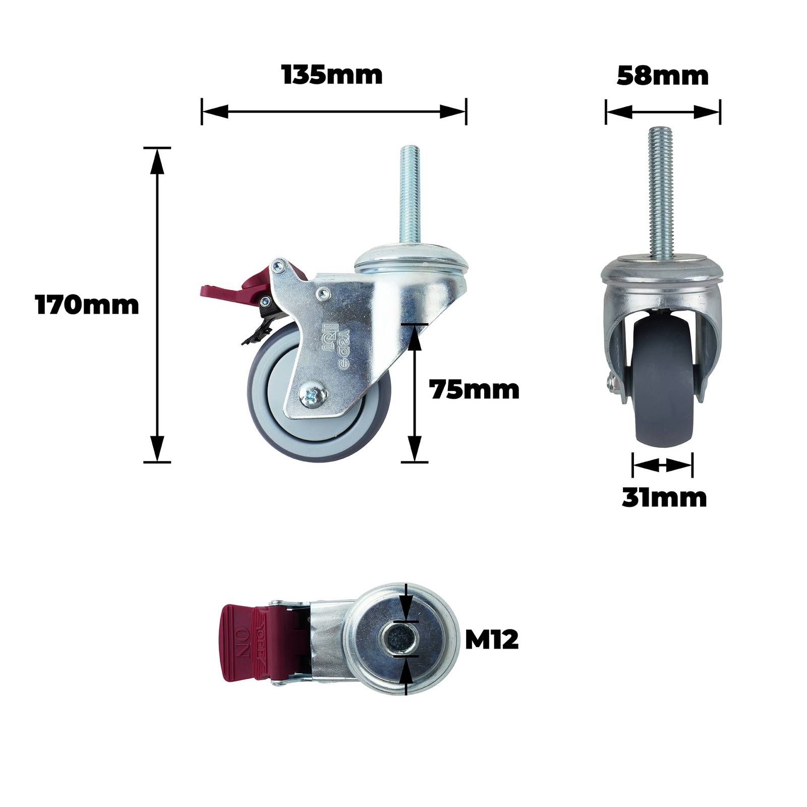 75MM GREY RUBBER SWIVEL BRAKE is designed for DIY enthusiasts needing dependable braking and smooth manoeuvrability. Incorporating precision bearings and a single raceway, this component offers a robust load capacity of 90 kgs, making it suitable for both light and industrial applications. The M12 mounting and stainless steel housing, combined with a durable rubber tyre, ensure longevity and consistent performance in demanding workshop and repair scenarios.Detailed