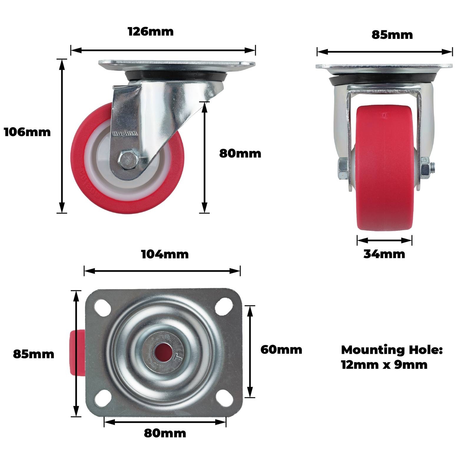80MM RED URETHANE SWIVEL PLATE CASTOR 130KG