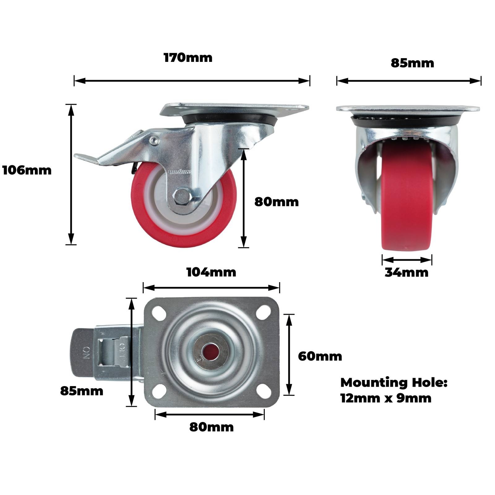 80mm Red Urethane Swivel Plate Brake Castor is designed for versatility and reliability in material handling. With a load capacity of 130kg, it is perfect for trolleys and carts. The cushioned urethane wheel provides quiet operation and enhanced floor grip, making it suitable for both commercial and utility environments. The swivel plate mount enables easy manoeuvrability while the integrated brake ensures safety during stationary use.Detailed