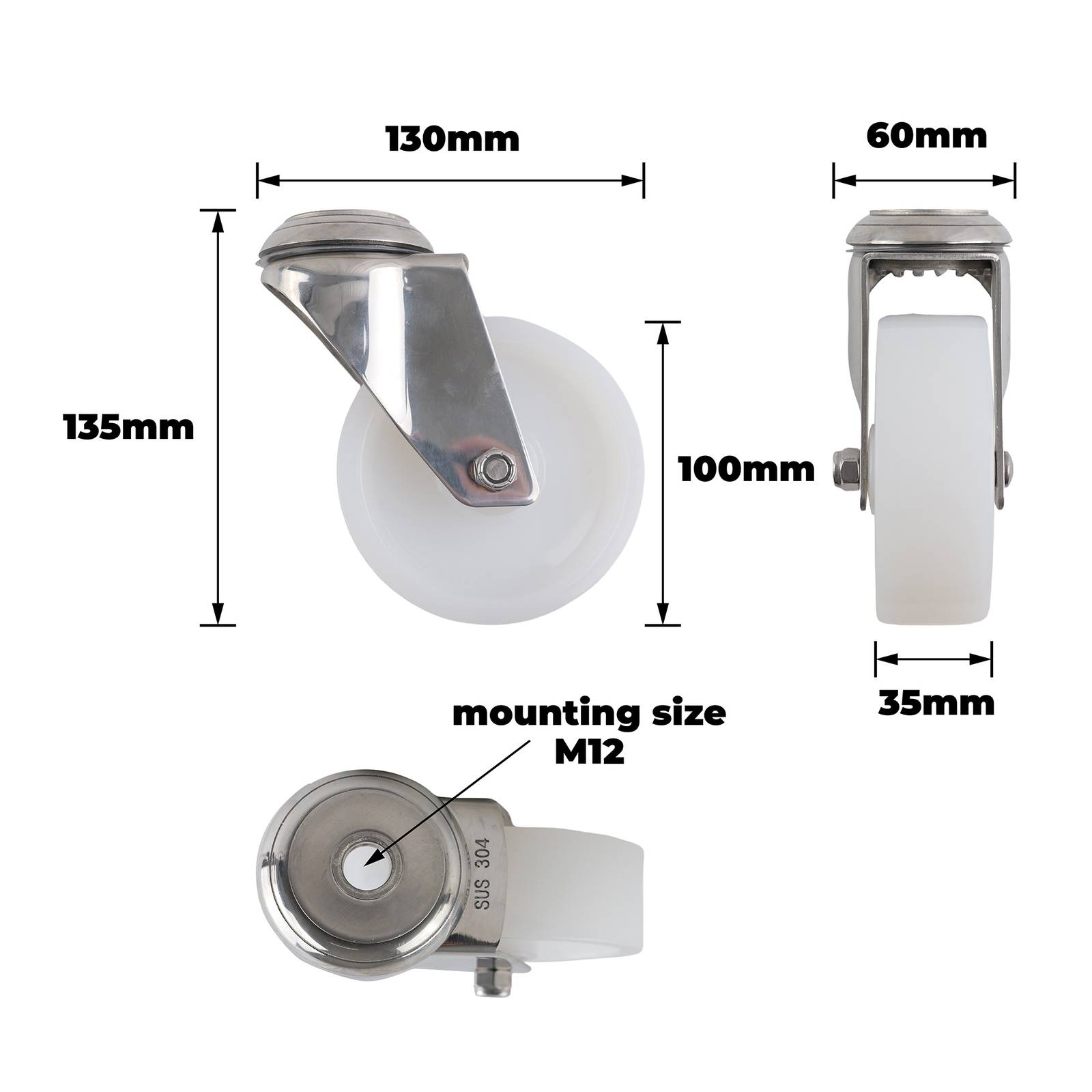 100MM WHITE NYLON BOLT HOLE CASTOR – This precision-engineered castor is designed for demanding DIY and industrial applications. Featuring a stainless steel housing and high-quality ball bearings, it provides reliable mobility and secure mounting. With a 100 kg load capacity and standard M12 bolt mounting, it is ideal for heavy-duty projects where durability and smooth movement are required. The robust design makes it a practical addition to various technical and commercial settings.Detailed