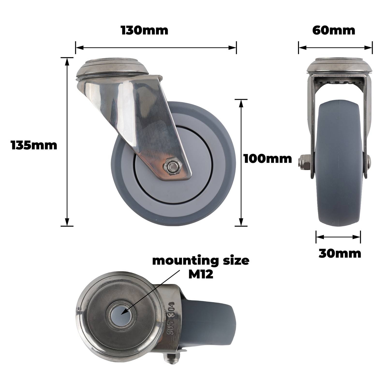 SS 100MM GREY RUBBER BOLT HOLE CASTOR