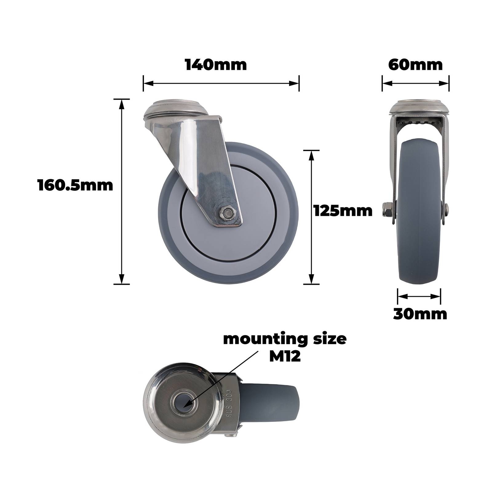 SS 125MM GREY RUBBER BOLT HOLE CASTOR