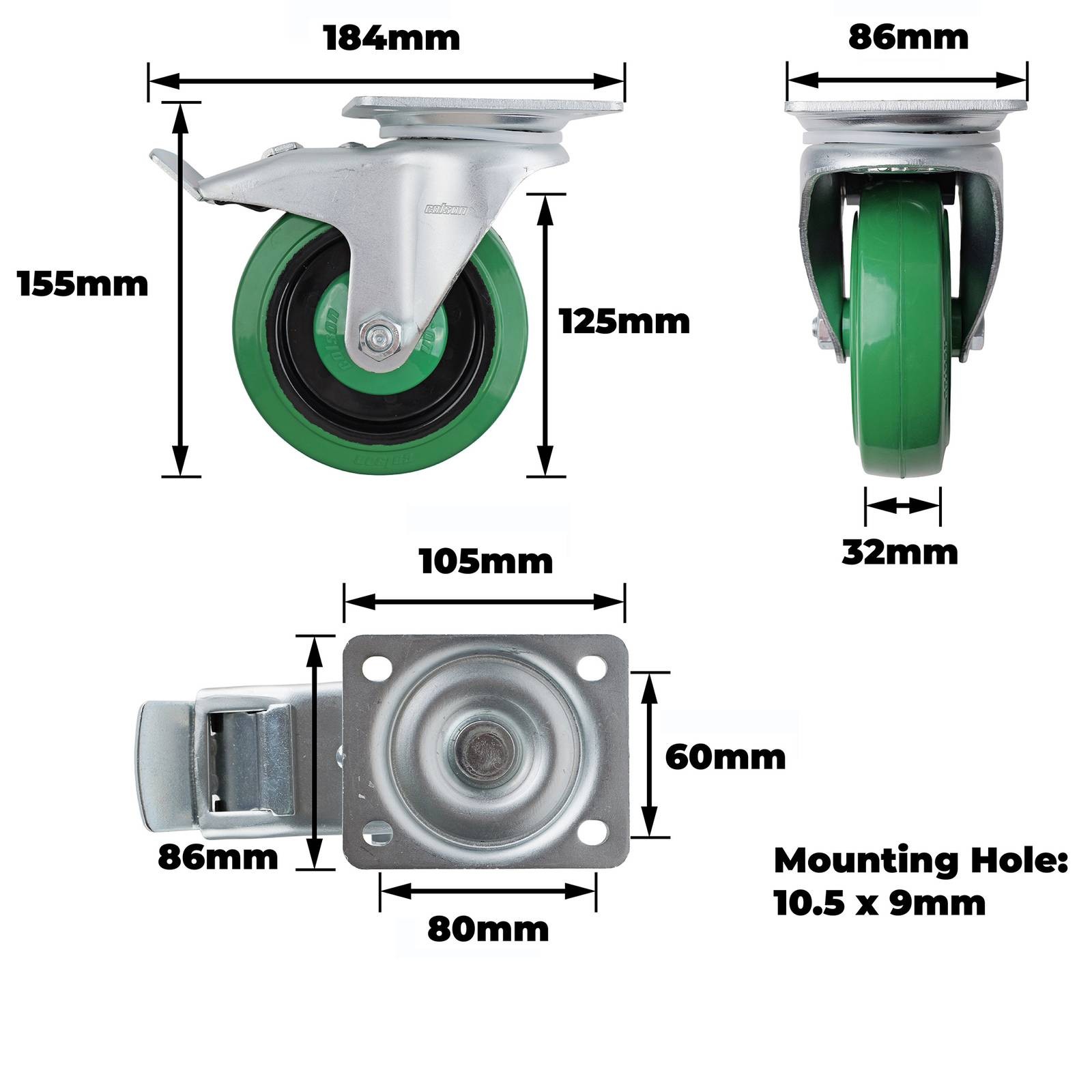 125MM Green Rubber Swivel Plate Brake Castor is designed for secure and reliable mobility in various indoor applications. With a load capacity of 200kg, it features a robust plate mount for stable installation. The rubber wheel construction ensures quiet operation and reduces vibrations, making it ideal for trolleys, carts, and material handling tasks in environments like workshops and commercial spaces.Detailed