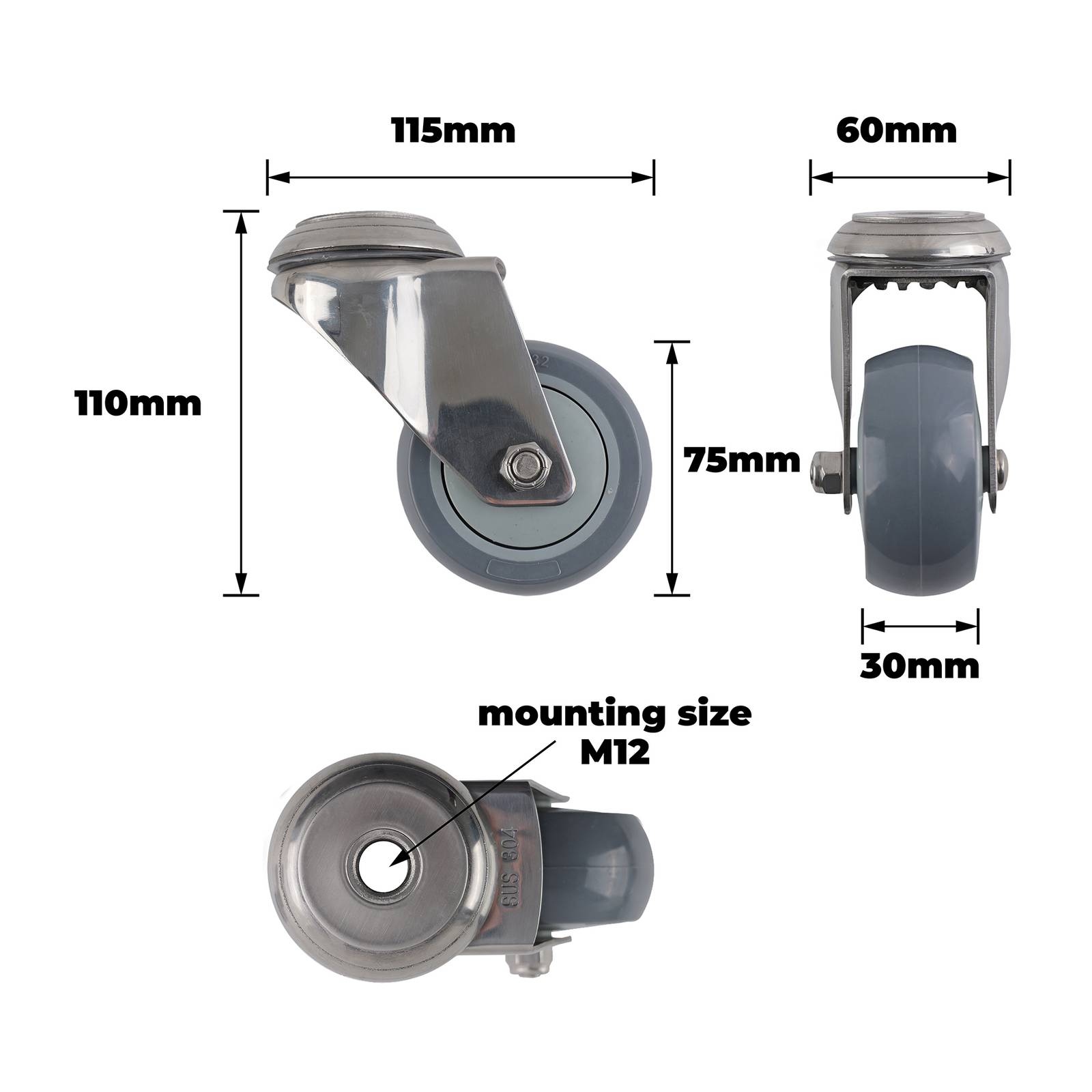 SS 75MM GREY URETHANE BOLT HOLE CASTOR