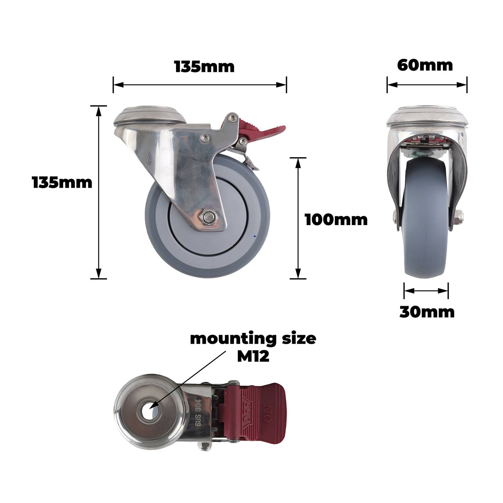 SS 100MM GREY RUBBER BOLT HOLE BRAKE CASTOR