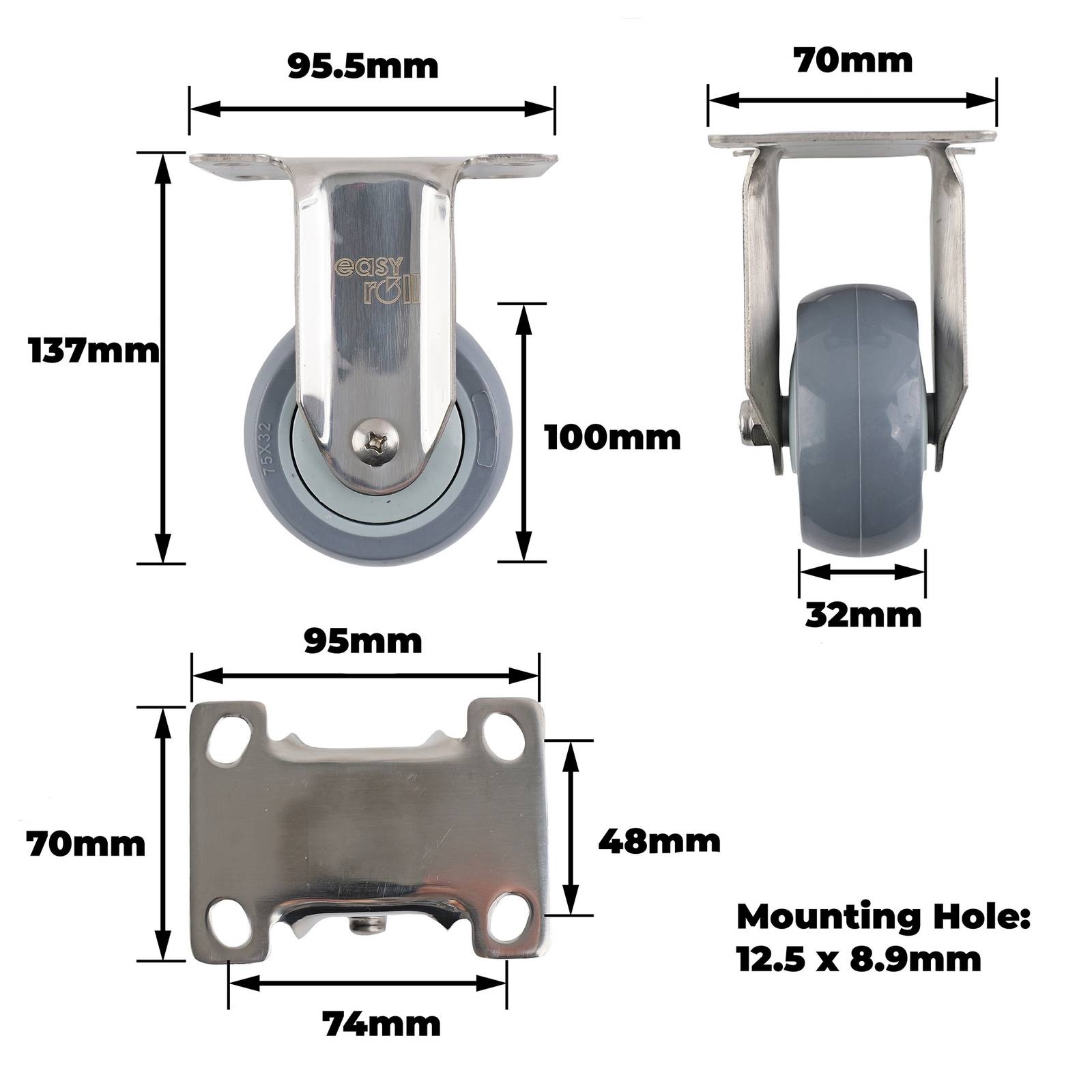SS 75MM GREY URETHANE FIXED PLATE CASTOR