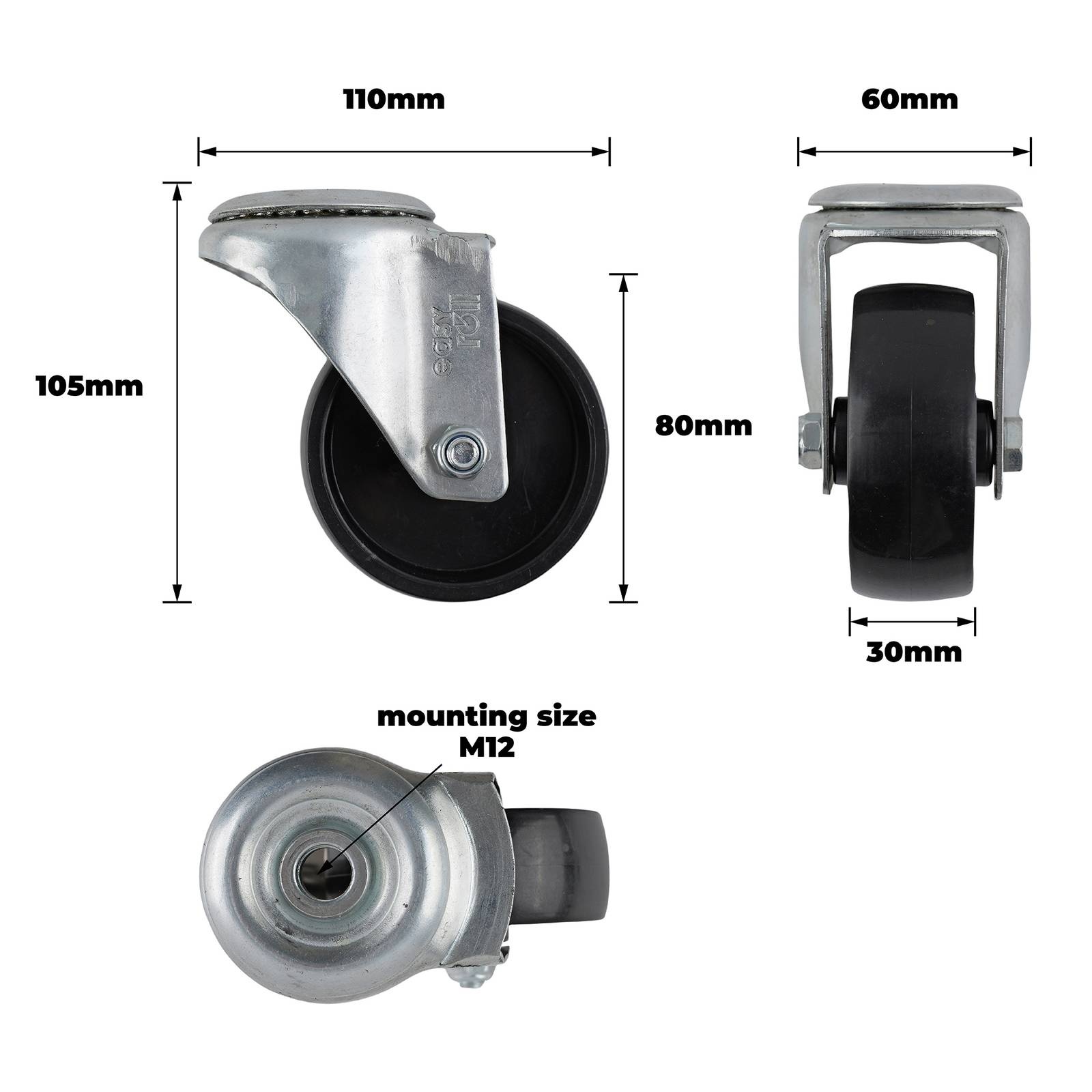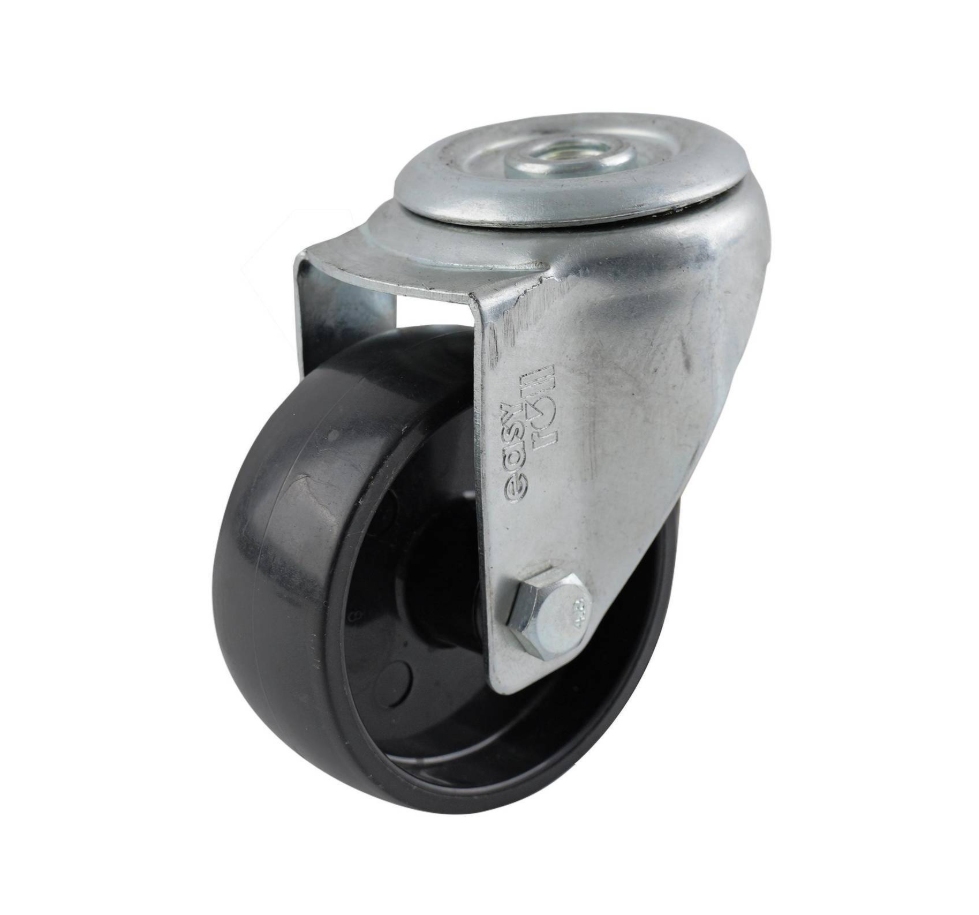 80MM BLACK POLY BOLT HOLE CASTOR is a robust castor engineered for practical mounting in DIY and industrial projects. Designed with a plain bearing system and single raceway configuration, it offers smooth movement and reliable rotation. Constructed with durable steel, this castor supports loads up to 80 kgs and features an M12 bolt mounting, making it a valuable solution for DIY enthusiasts seeking dependable and technically precise components.Detailed