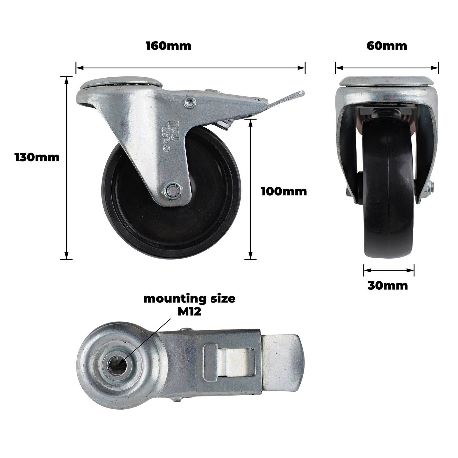 This robust brake castor is engineered for DIY enthusiasts and technical users. Designed with a plain bearing and single raceway for smooth, reliable performance, it is ideal for heavy-duty tasks requiring controlled movement. The durable steel housing and 100 kgs load capacity make it dependable for various practical applications. With a secure M12 mounting configuration, it offers precise installation for demanding retail and online projects.Detailed