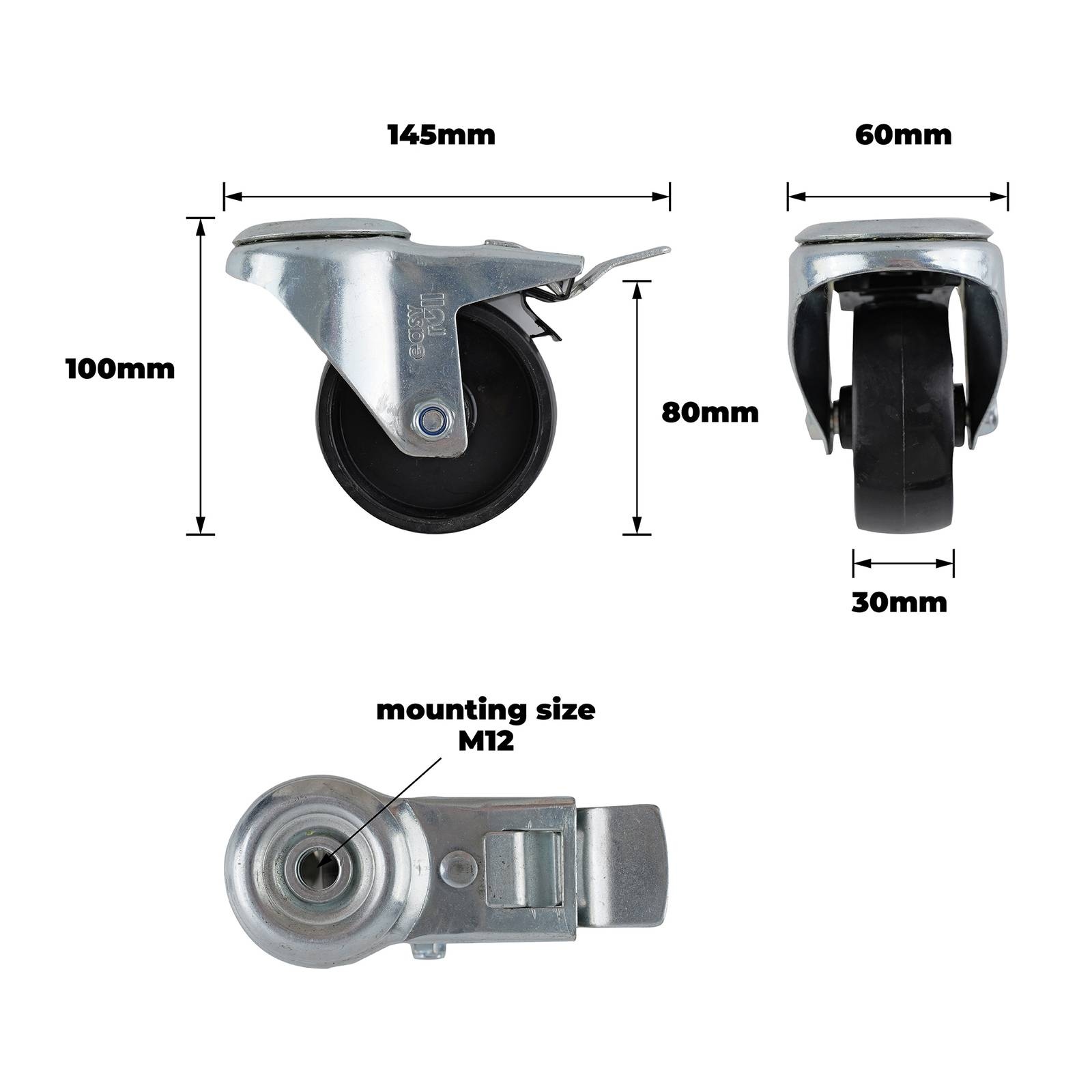80MM BLACK POLY BOLT HOLE BRAKE CASTOR is designed for robust DIY and industrial applications. Featuring a plain bearing mechanism and single raceway, it effectively supports loads up to 80 kgs. The M12 mounting size along with a durable steel housing provide reliable performance, making it valuable for projects that require precision and dependability in equipment movement.Detailed