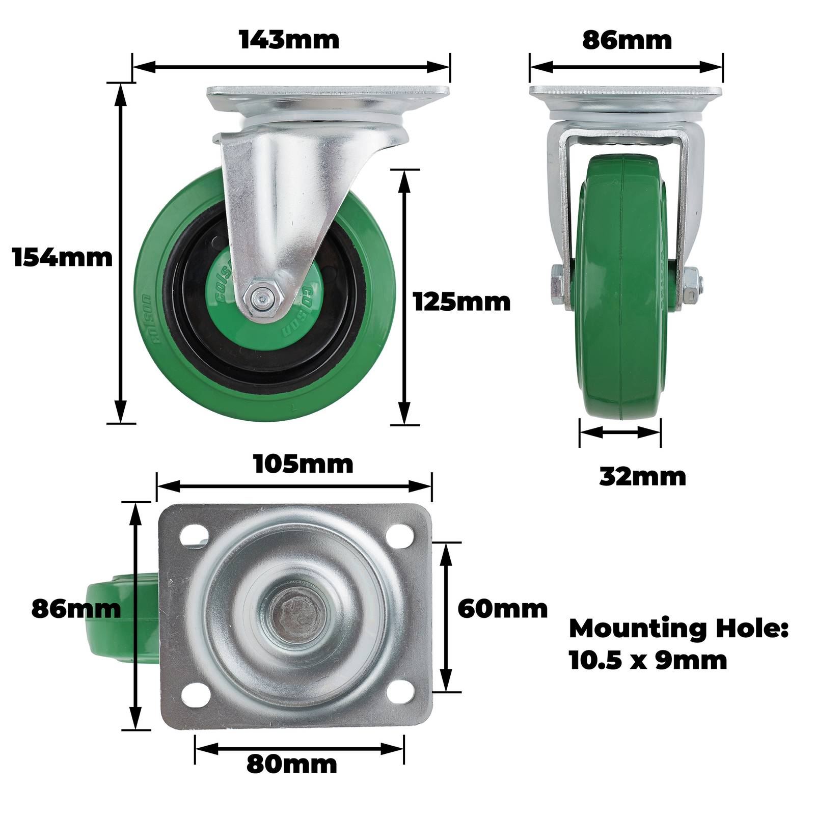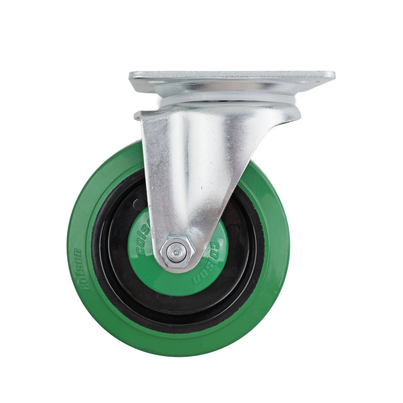 125MM Green Rubber Swivel Plate Castor is designed for reliable performance in various applications. With a robust structure and a load capacity of 200kg, it is ideal for indoor use on trolleys and carts. The rubber wheel ensures quiet operation and shock absorption, making it perfect for environments that require careful manoeuvrability and floor protection.Detailed