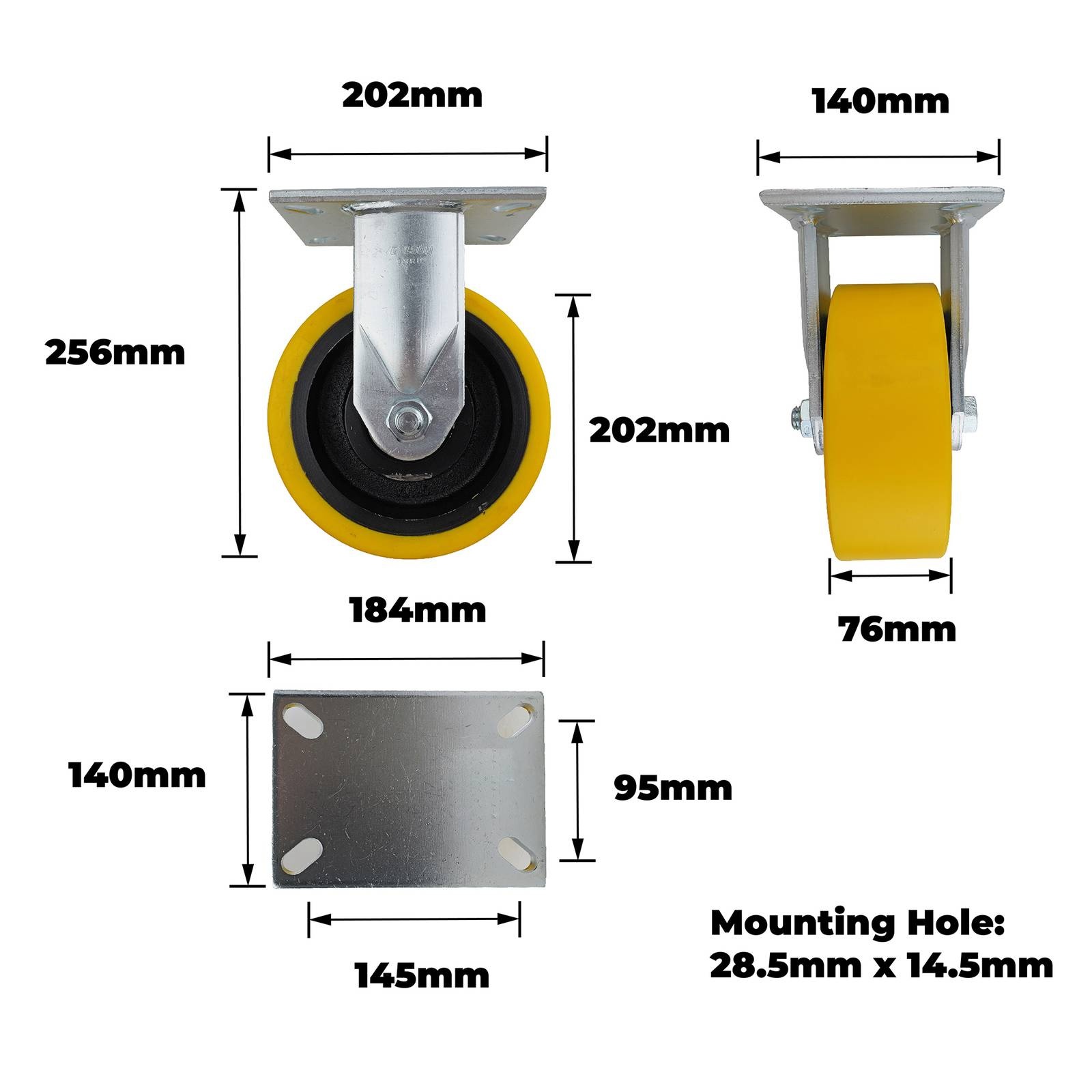 200MM URETHANE/CAST IRON FIXED PLATE CASTOR is a robust rigid caster engineered for industrial and DIY applications. Designed with a super heavy duty fabricated housing and precision bearings, it delivers outstanding durability and low rolling resistance, making heavy loads easier to manage. Its urethane-on-cast iron wheel maximises load capacity while protecting floor surfaces. The design is practical and maintenance is simplified with an easily accessible grease nipple on the head race, ideal for demanding projects.Detailed