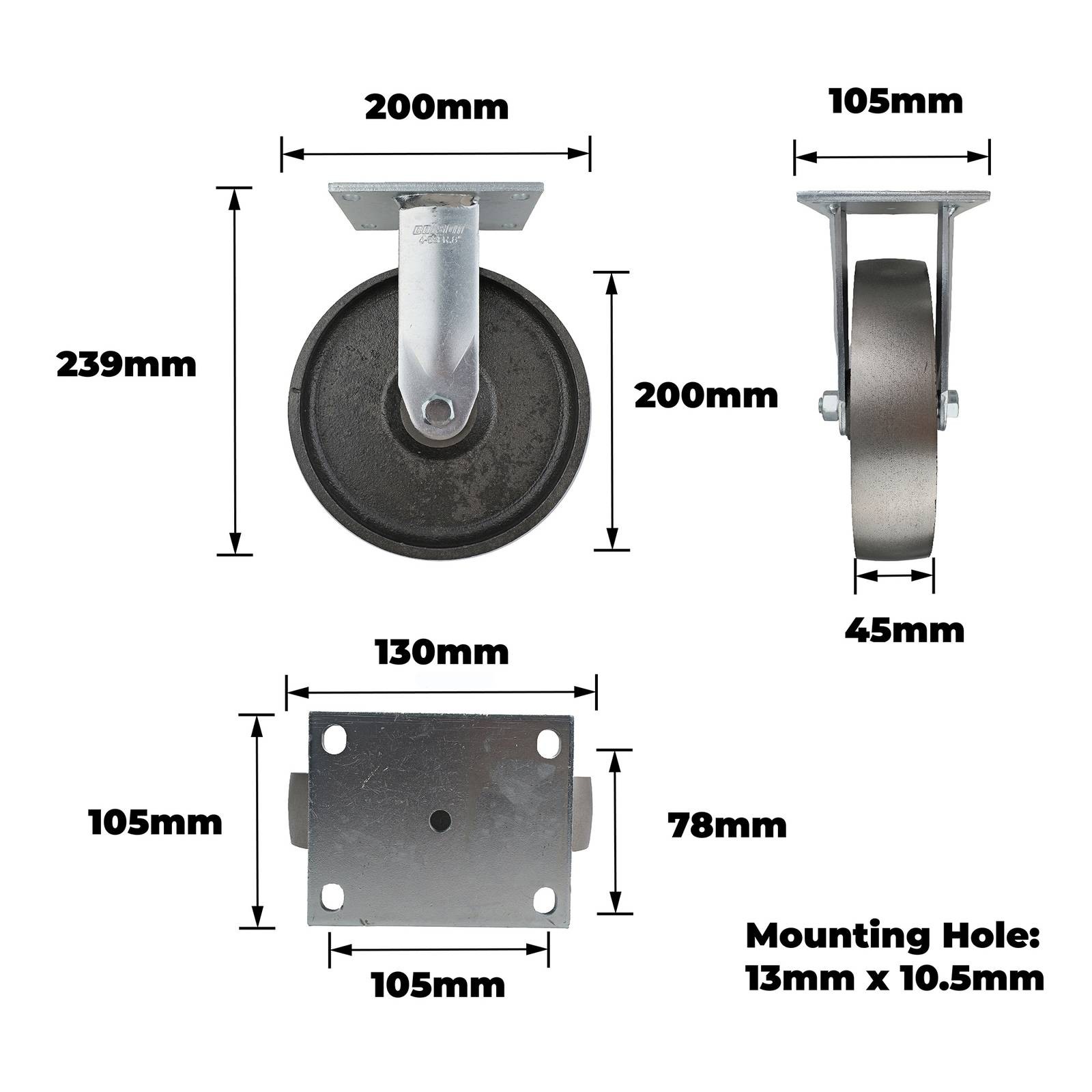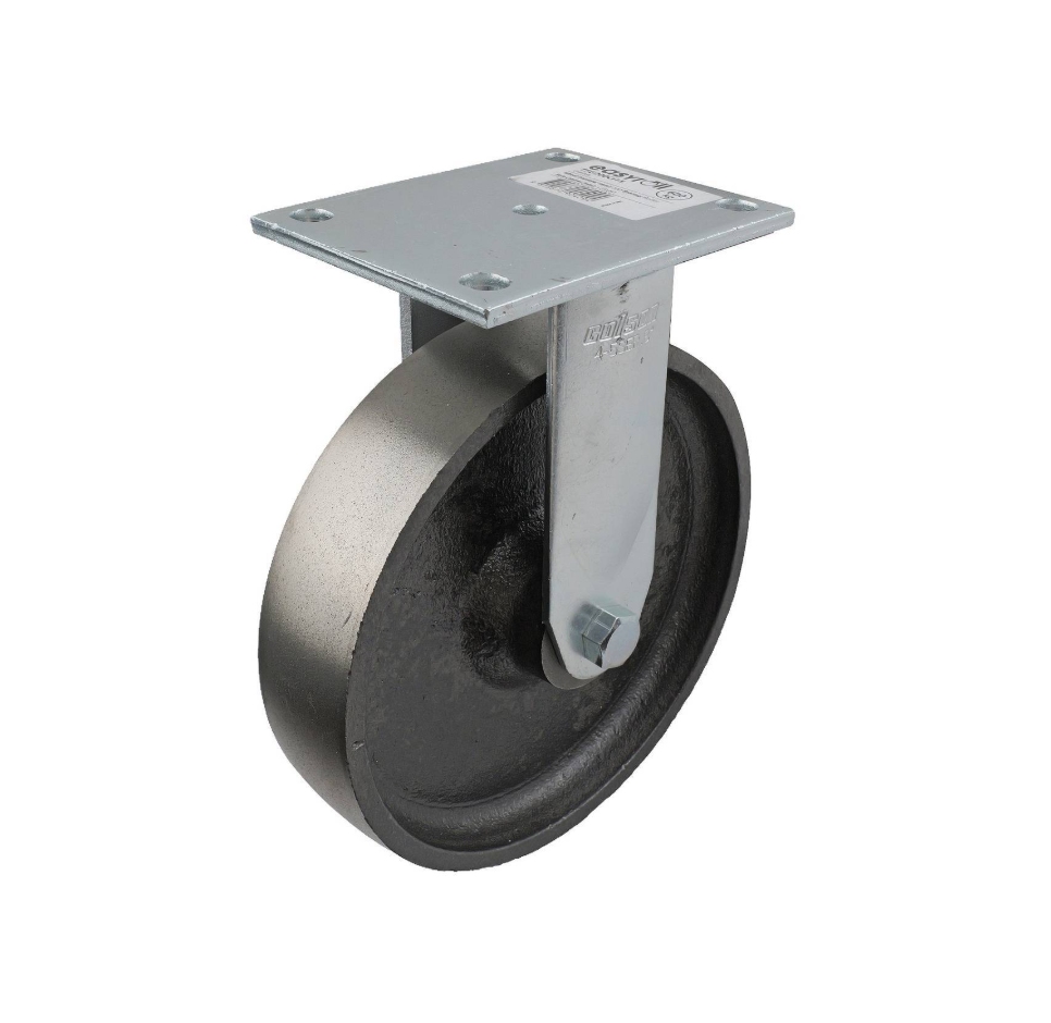 200MM CAST IRON FIXED PLATE CASTOR is engineered for industrial and heavy-duty DIY applications. Featuring a cast iron wheel core and precision roller bearings, this rigid castor promises durability and low maintenance. The heavy duty fabricated housing, accented with a zinc plating finish, withstands high impact loads. Its fixed plate configuration ensures straight tracking during transport, making it an indispensable choice for technical projects that demand reliable and robust performance.Detailed