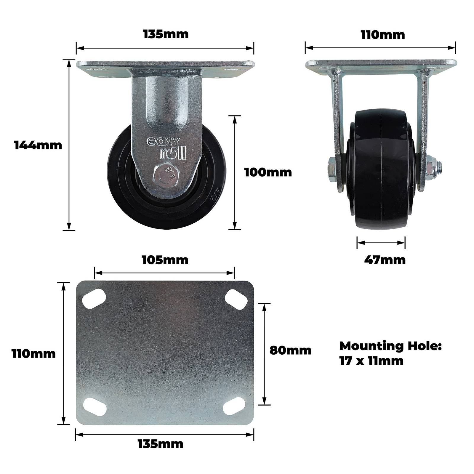 100MM BLACK NYLON FIXED PLATE CASTOR provides a robust, fixed mobility solution for DIY projects and industrial applications. This precision-engineered castor features a high-quality precision bearing and a single raceway design, ensuring smooth, reliable rolling even under heavy loads of up to 320 kg. Constructed with a steel wheel core and a durable polyurethane tyre, it offers exceptional stability and longevity for practical, hands-on use in a variety of settings.Detailed