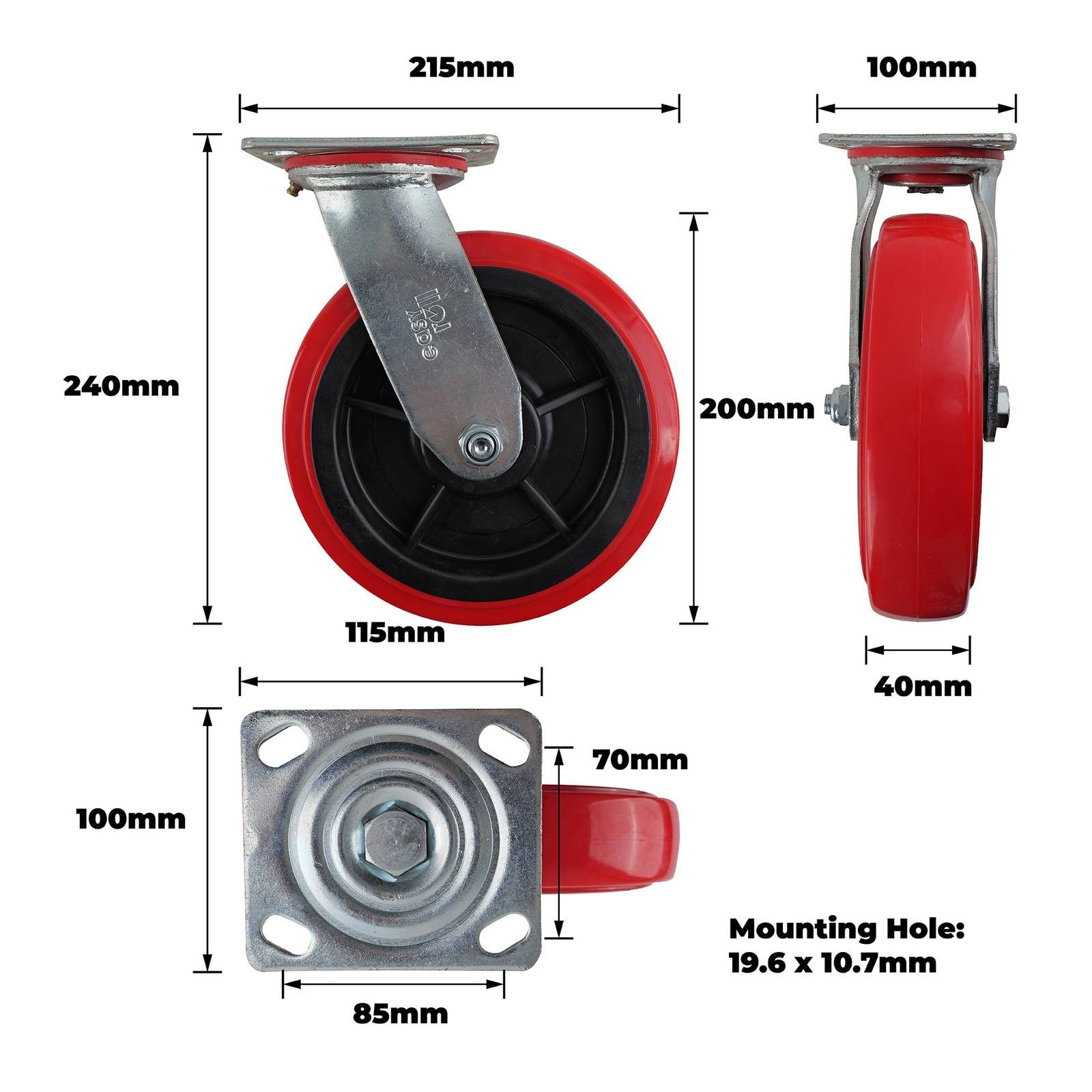 200MM RED URETHANE SWIVEL PLATE CASTOR offers dependable mobility for various DIY and industrial applications. This swivel castor is engineered with a robust steel housing and carbon steel ball bearings, providing a high load capacity of 455kgs. Its single raceway design ensures stability and precise movement during installation. The red urethane outer plate enhances wear resistance while adding a practical and attractive finish for workshop and commercial use.Detailed