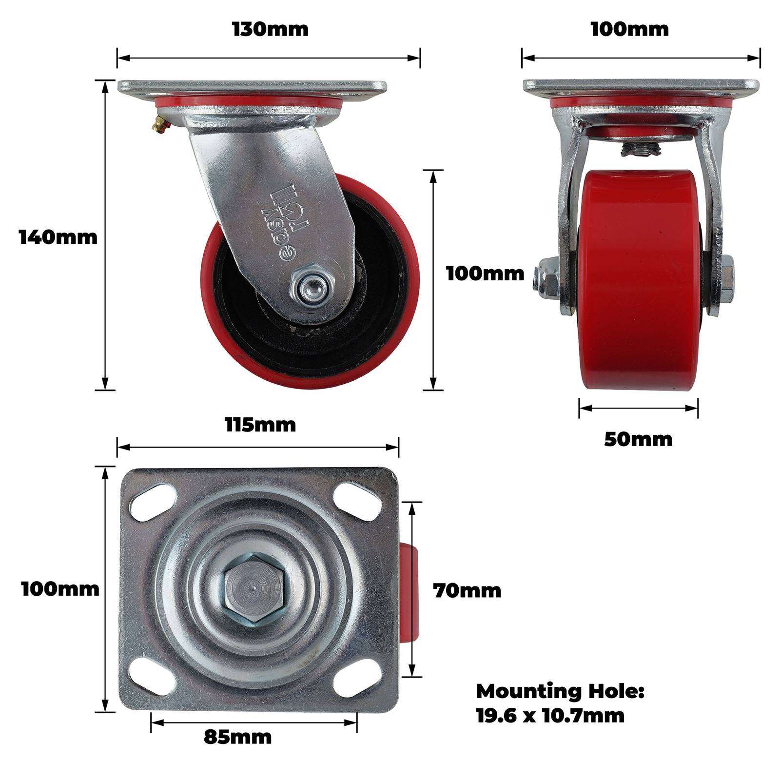 100MM RED URETHANE/CI SWIVEL PLATE CASTOR is engineered for DIY enthusiasts and technical users who require a robust, manoeuvrable castor for heavy-duty applications. This swivel castor offers a reliable solution for projects that involve moving heavy equipment or furniture. With a precision bearing setup and a durable steel structure, it delivers smooth movement and exceptional load-bearing performance while meeting the exacting demands of practical, hands-on projects.Detailed