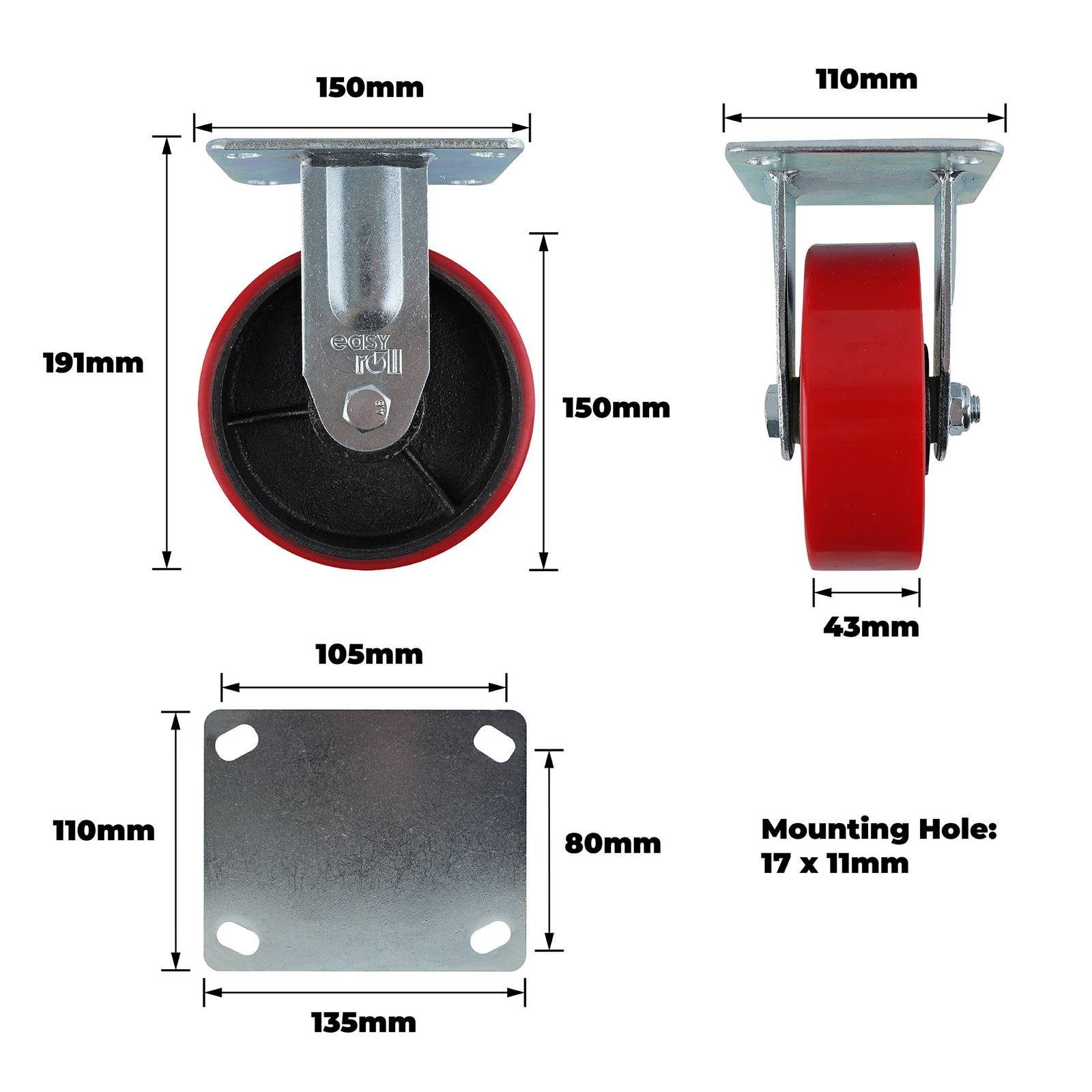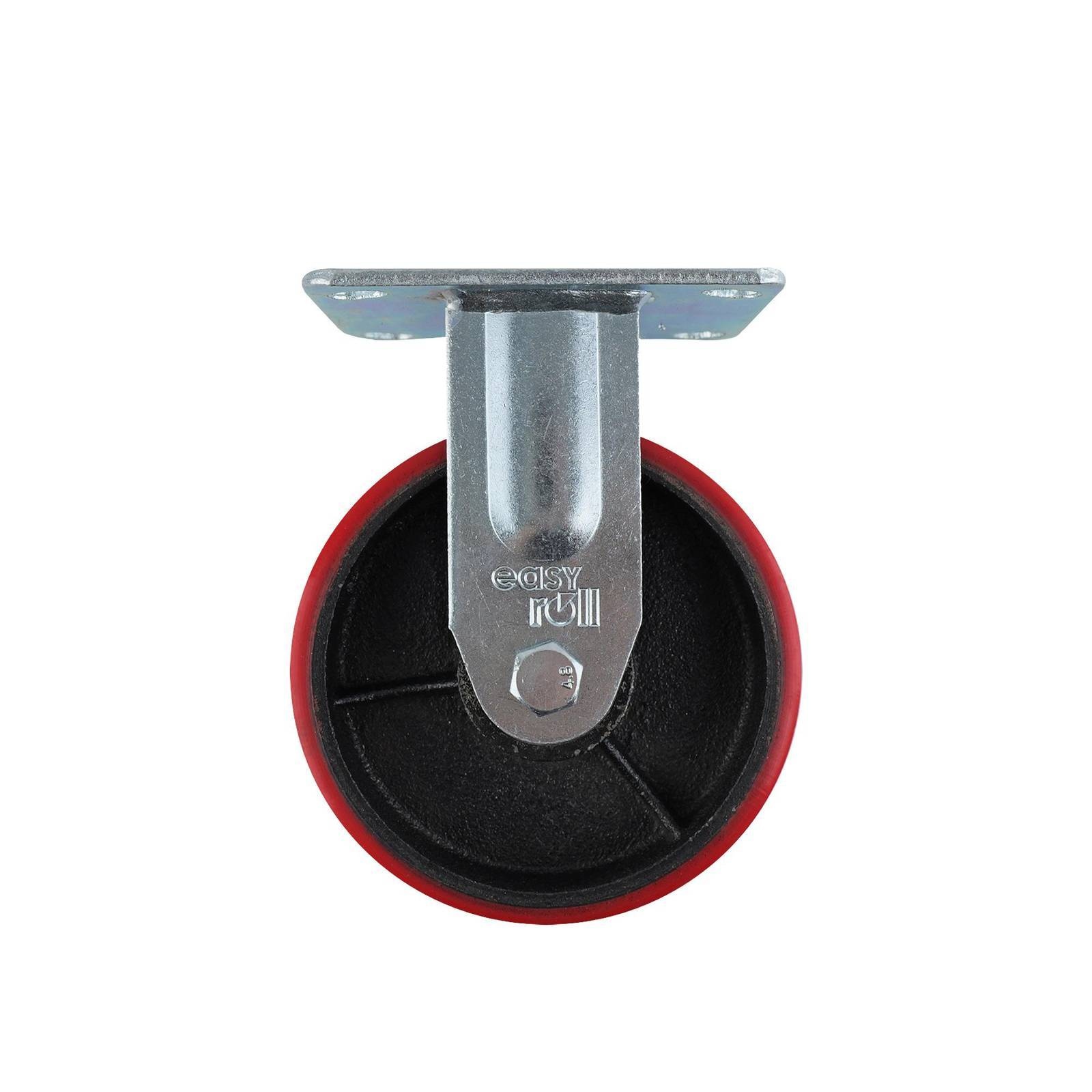 Fixed Castor is a robust 150MM red urethane and CI fixed plate castor designed specifically for demanding DIY projects and industrial applications. Constructed with precision bearings and a sturdy steel housing, this castor ensures smooth operation on various surfaces while supporting heavy loads up to 410 kilograms. Its single raceway design, reinforced with carbon steel bearings and a durable polypropylene wheel core, makes it a practical, long-lasting choice for retail and online buyers who value technical performance.Detailed