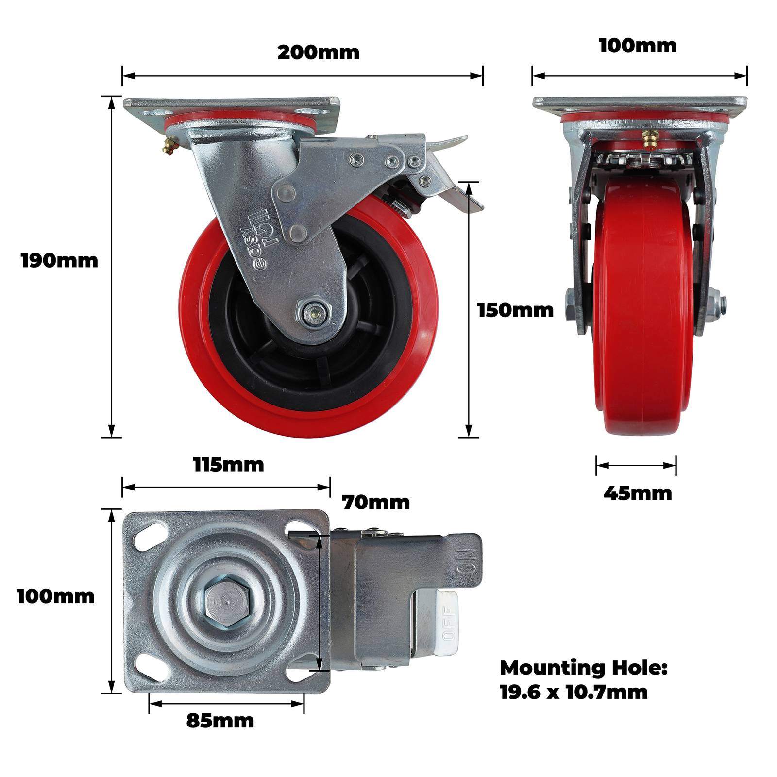 150MM RED URETHANE SWIVEL PLATE BRAKE CASTOR