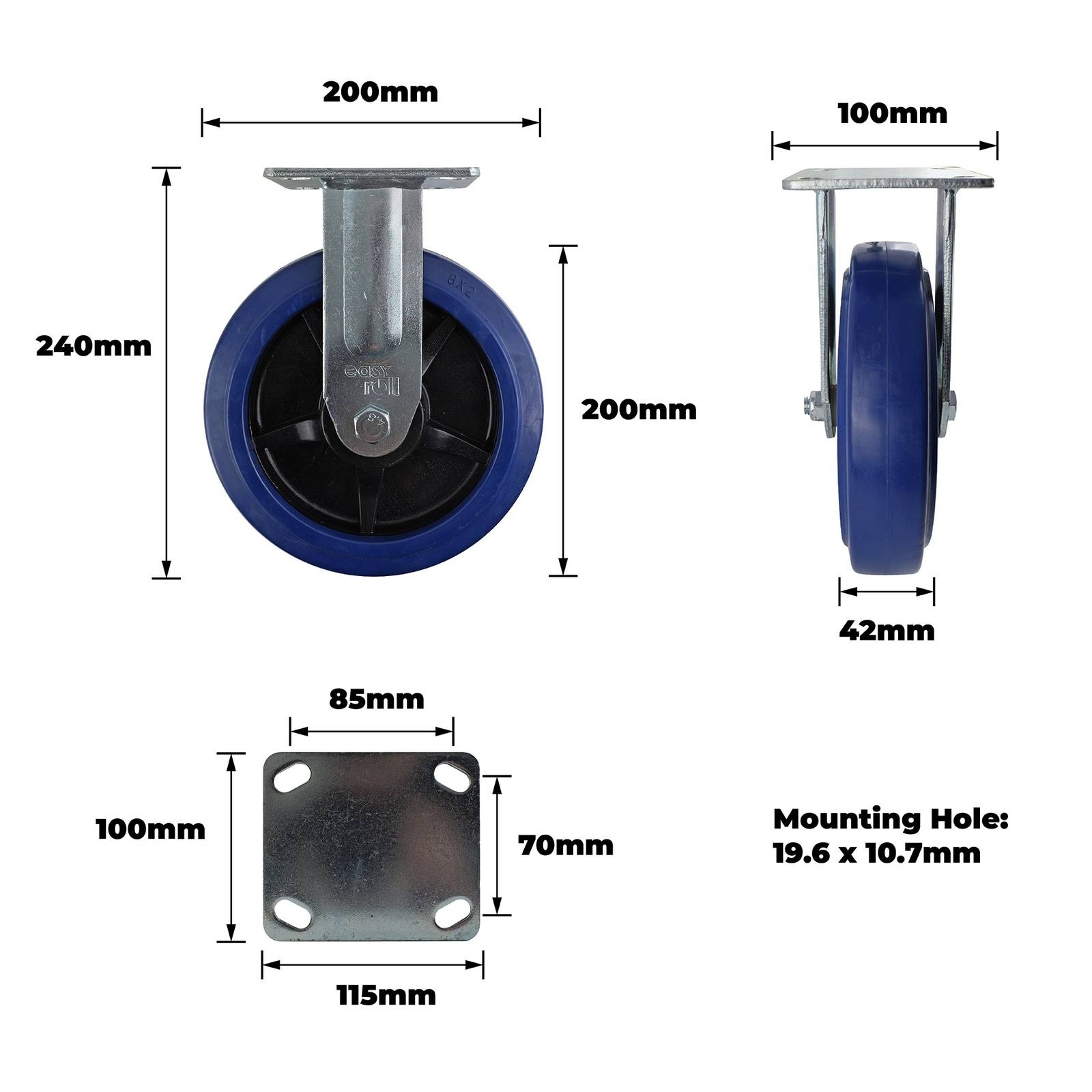 200MM BLUE RUBBER FIXED PLATE CASTOR