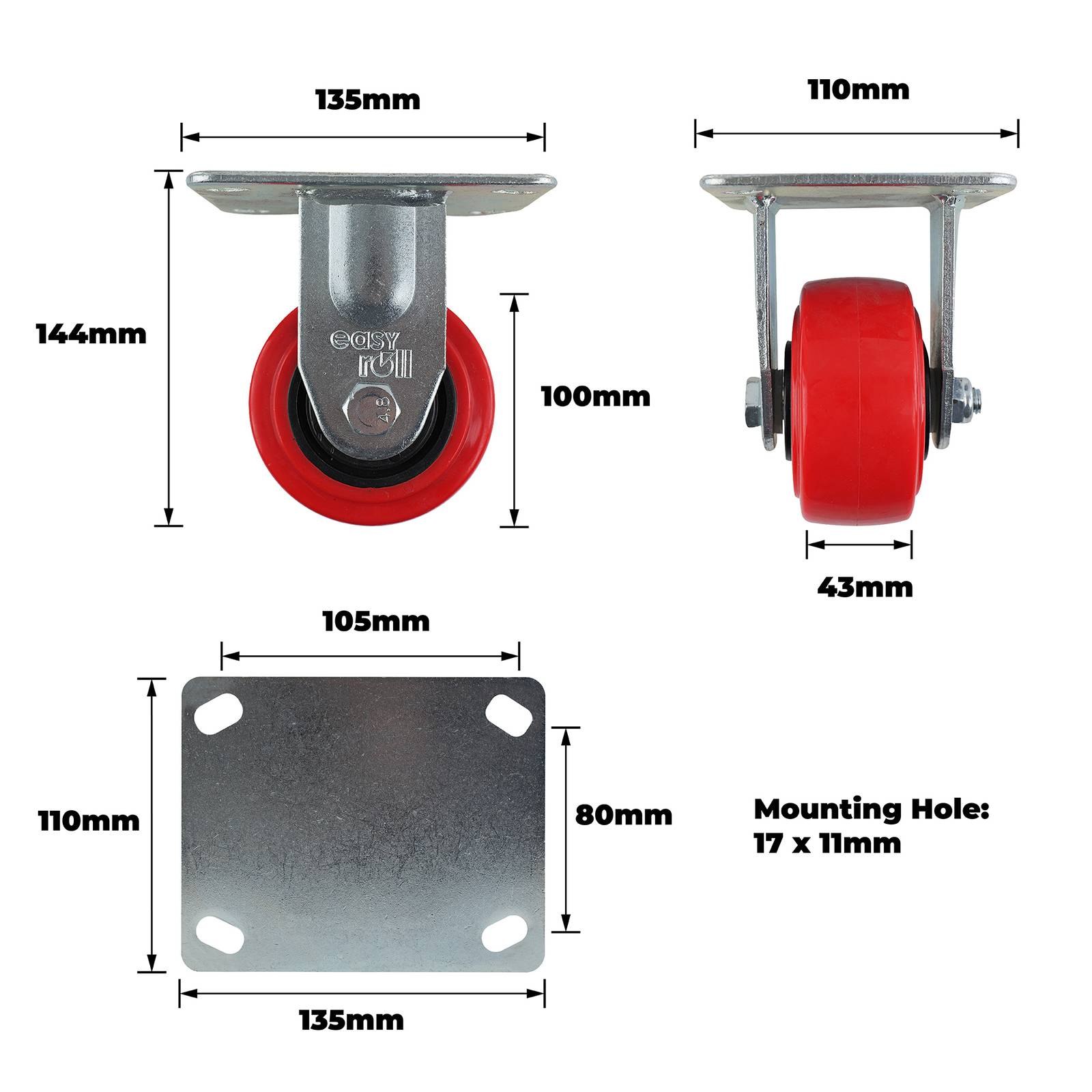 100MM Red Urethane Fixed Plate Castor is engineered for robust performance in both industrial and DIY settings. This fixed castor features precision bearings with a single raceway design to ensure smooth movement under heavy loads up to 280kgs. The blend of a steel housing, polypropylene wheel core and rubber tyre delivers durability and reliability, making it ideal for fixed furniture, equipment and workshop machinery where practical, secure mobility matters.Detailed