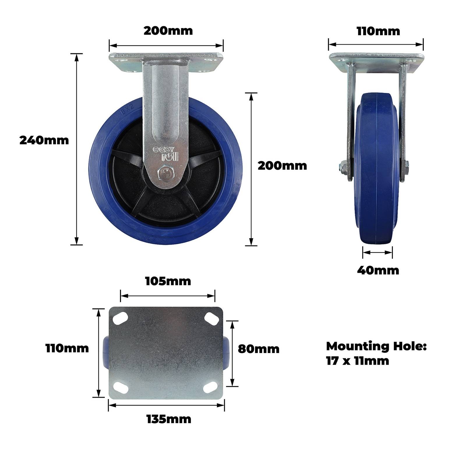This fixed castor is engineered for DIY enthusiasts requiring robust and reliable mobility solutions. Designed with a precision bearing within a single raceway, this castor supports loads up to 500kg and features a durable steel housing with carbon steel bearings. Its 200mm blue rubber plate not only enhances visibility but also provides excellent grip and stability, making it a practical choice for both retail and online technical projects.Detailed