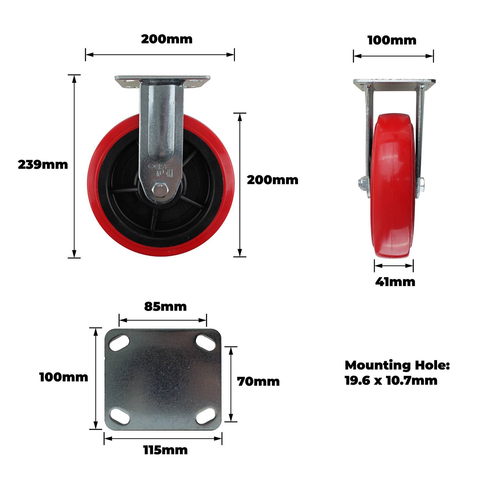 The 200MM RED URETHANE FIXED PLATE CASTOR is a robust fixed castor engineered for high-demand DIY projects. Designed with a ball bearing assembly and a single raceway system, it supports loads up to 455 kgs with precision. The urethane wheel paired with a durable steel housing facilitates smooth movement and reliable performance. Ideal for retail and online DIY enthusiasts, this castor offers practical technical advantages essential for heavy-duty applications.Detailed