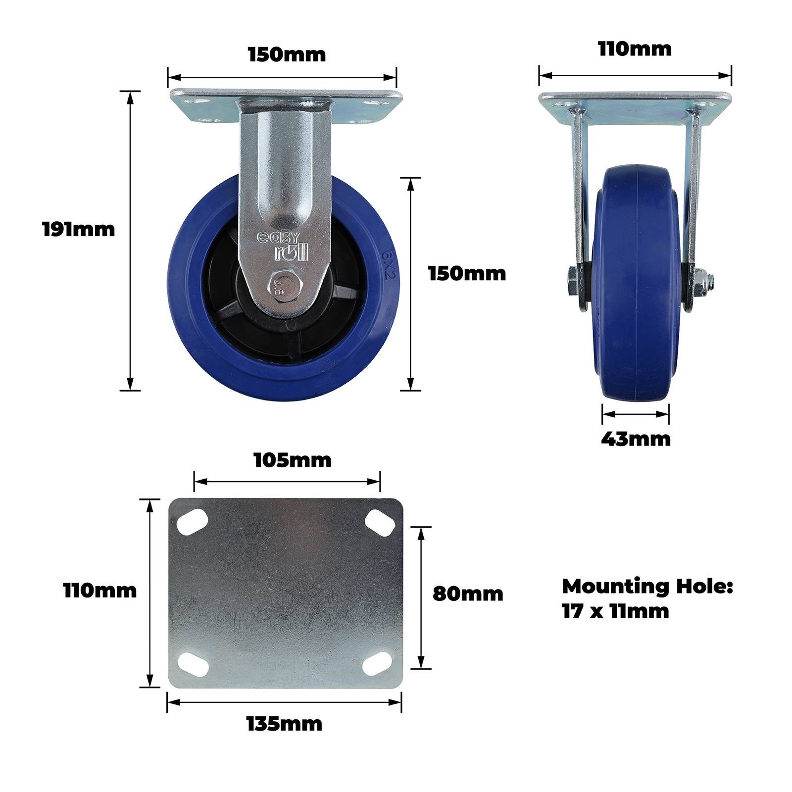 150MM BLUE RUBBER FIXED PLATE CASTOR