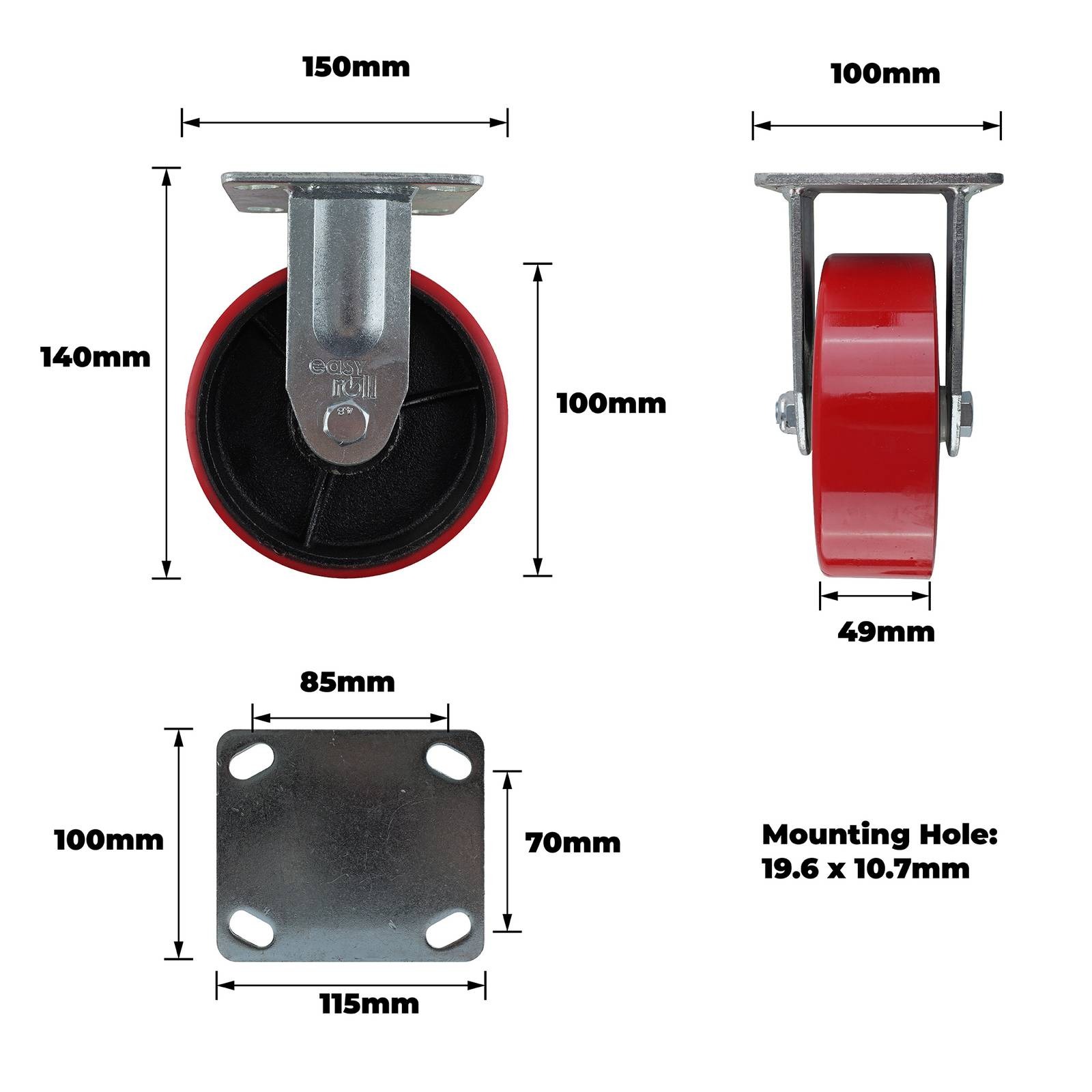 150MM RED URETHANE/CI FIXED PLATE CASTOR