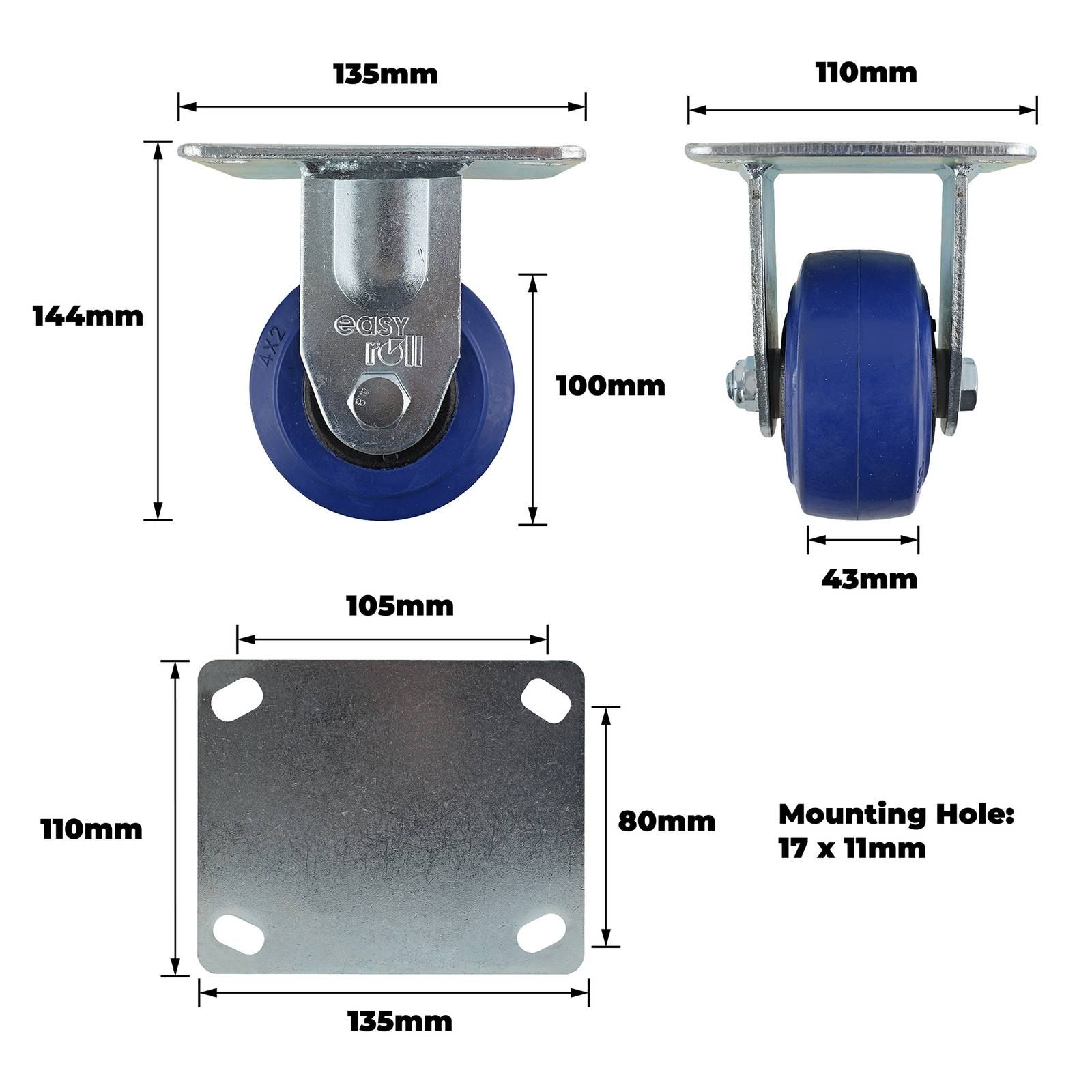 100MM BLUE RUBBER FIXED PLATE CASTOR is a robust fixed castor designed for projects that demand durability and precise movement. Ideal for DIY-savvy enthusiasts, this unit features a precision bearing system and heavy-duty steel construction, ensuring reliable performance in both static and dynamic settings. The blue rubber wheel provides stable support while handling up to 200 kgs, making it a practical choice for equipment and furniture requiring seamless manoeuvrability.Detailed