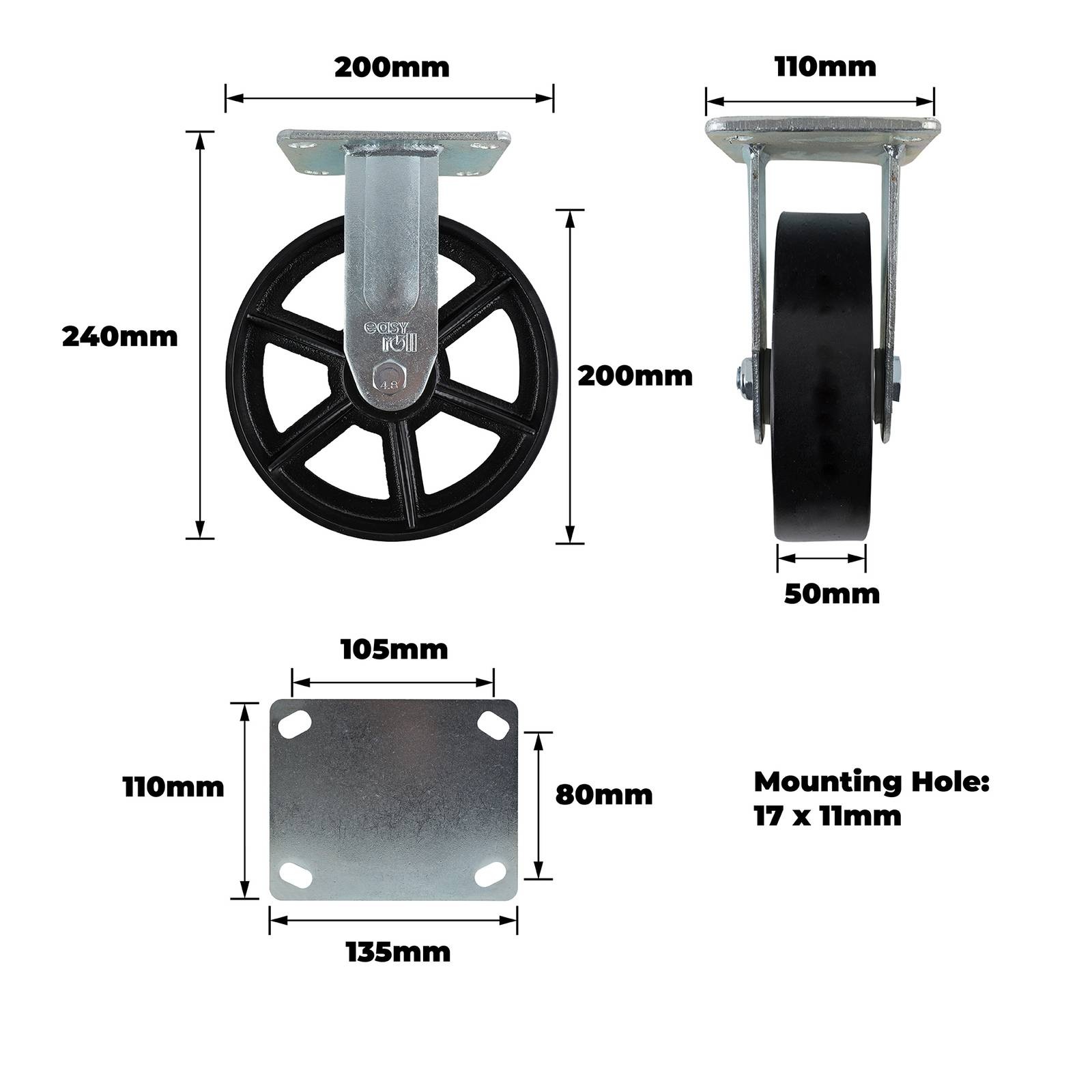 The 200mm fixed castor from easyroll is engineered for demanding industrial and DIY projects. Constructed from steel with a robust cast iron plate and precision bearings, it supports heavy loads up to 600kg. The polyurethane wheel ensures smooth, quiet operation across various surfaces. This castor offers a practical, heavy-duty mobility solution for workshops, retail settings and professional applications requiring reliable performance.Detailed