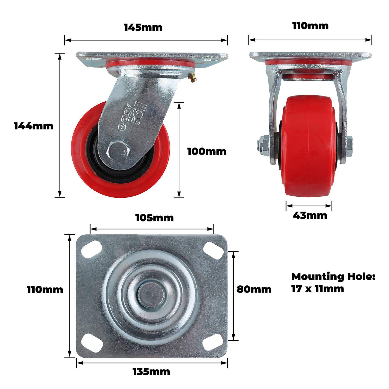 100MM RED URETHANE SWIVEL PLATE CASTOR is a robust, precision-engineered castor suitable for a range of DIY projects and industrial applications. Designed with precision bearings and a single raceway, it supports loads up to 280kgs. The product features a durable polypropylene wheel core paired with a rubber tyre, a steel housing, and carbon steel bearings. Its reliable construction provides smooth manoeuvrability and longevity, making it a practical solution for enhancing mobility in various equipment and furnishings.Detailed