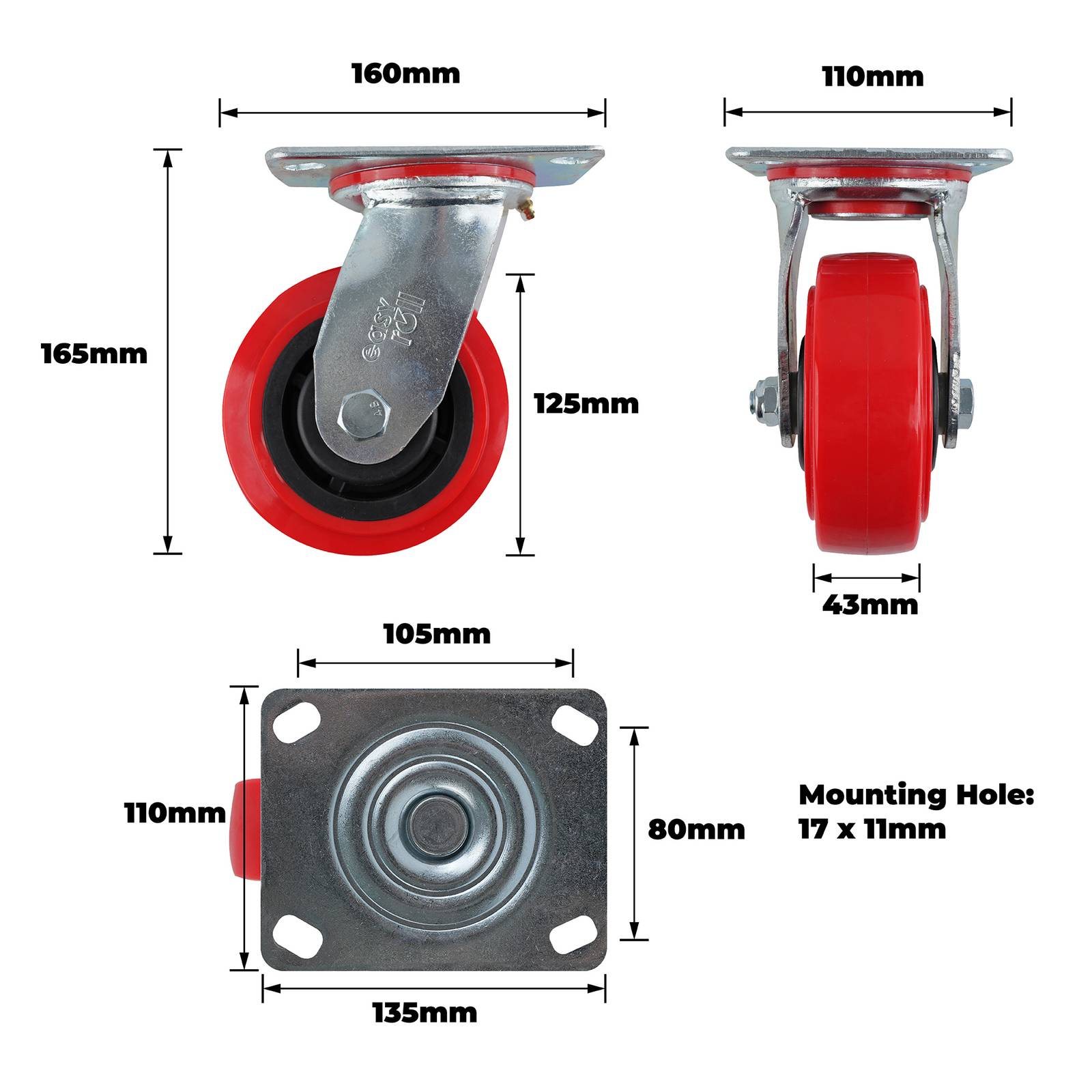 125MM RED URETHANE SWIVEL PLATE CASTOR